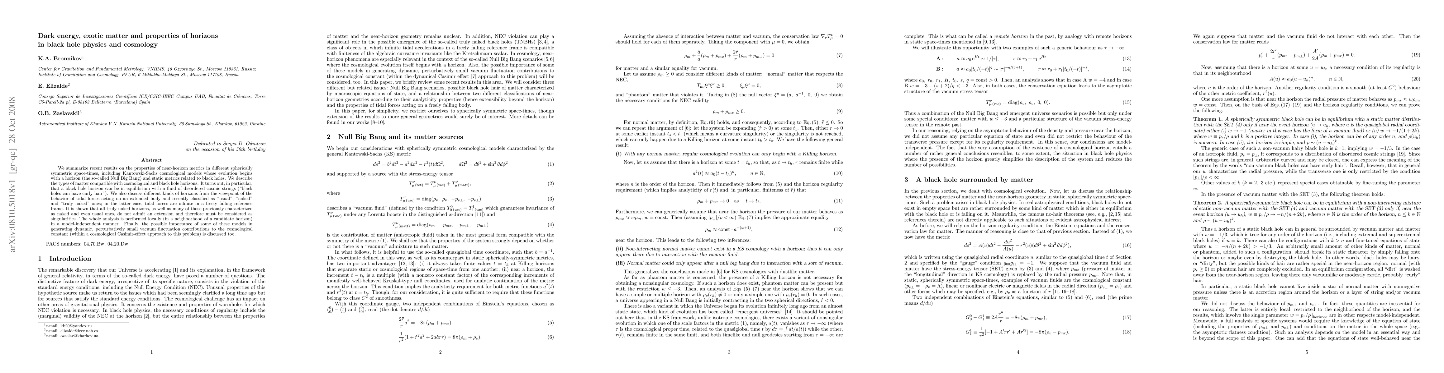 We summarize recent results on the properties of near-horizon metrics in different spherically symmetric space-times, including Kantowski-Sachs cosmological models whose evolution begins with a horizon (the so-called Null Big Bang) and static metrics related to black holes. We describe the types of matter compatible with cosmological and black-hole horizons. It turns out, in particular, that a black hole horizon can be in equilibrium with a fluid of disordered cosmic strings ("black holes can have curly hair"). We also discuss different kinds of horizons from the viewpoint of the behavior of tidal forces acting on an extended body and recently classified as "usual", "naked" and "truly naked" ones; in the latter case, tidal forces are infinite in a freely falling reference frame. It is shown that all truly naked horizons, as well as many of those previously characterized as naked and even usual ones, do not admit an extension and therefore must be considered as singularities. The whole analysis is performed locally (in a neighborhood of a candidate horizon) in a model-independent manner. Finally, the possible importance of some of these models in generating dynamic, perturbatively small vacuum fluctuation contributions to the cosmological constant (within a cosmological Casimir-effect approach to this problem) is discussed.