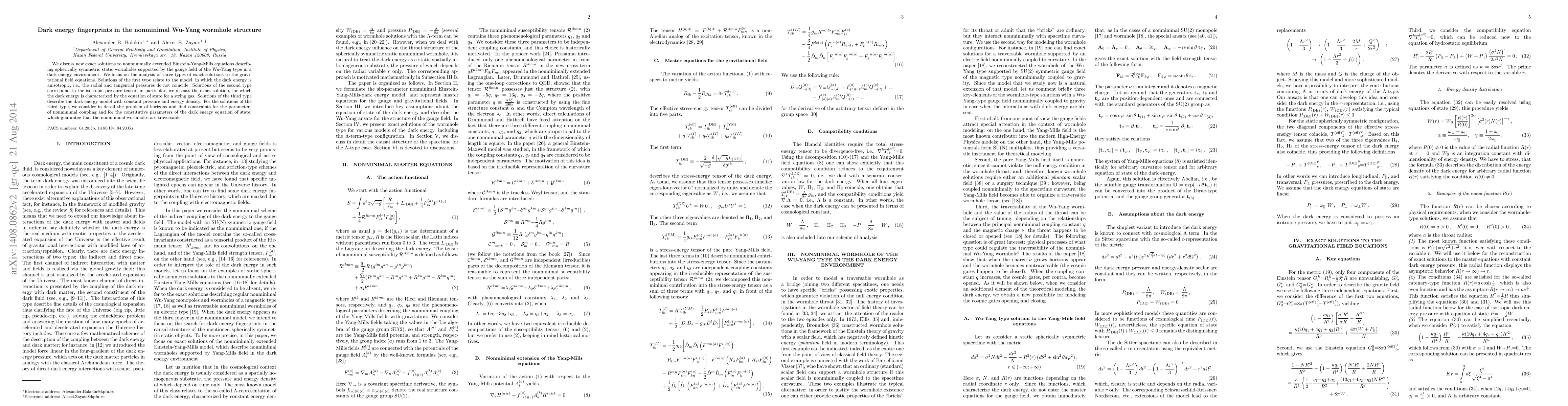 We discuss new exact solutions to nonminimally extended Einstein-Yang-Mills equations describing spherically symmetric static wormholes supported by the gauge field of the Wu-Yang type in a dark energy environment. We focus on the analysis of three types of exact solutions to the gravitational field equations. Solutions of the first type relate to the model, in which the dark energy is anisotropic, i.e., the radial and tangential pressures do not coincide. Solutions of the second type correspond to the isotropic pressure tensor; in particular, we discuss the exact solution, for which the dark energy is characterized by the equation of state for a string gas. Solutions of the third type describe the dark energy model with constant pressure and energy density. For the solutions of the third type, we consider in detail the problem of horizons and find constraints for the parameters of nonminimal coupling and for the constitutive parameters of the dark energy equation of state, which guarantee that the nonminimal wormholes are traversable.
