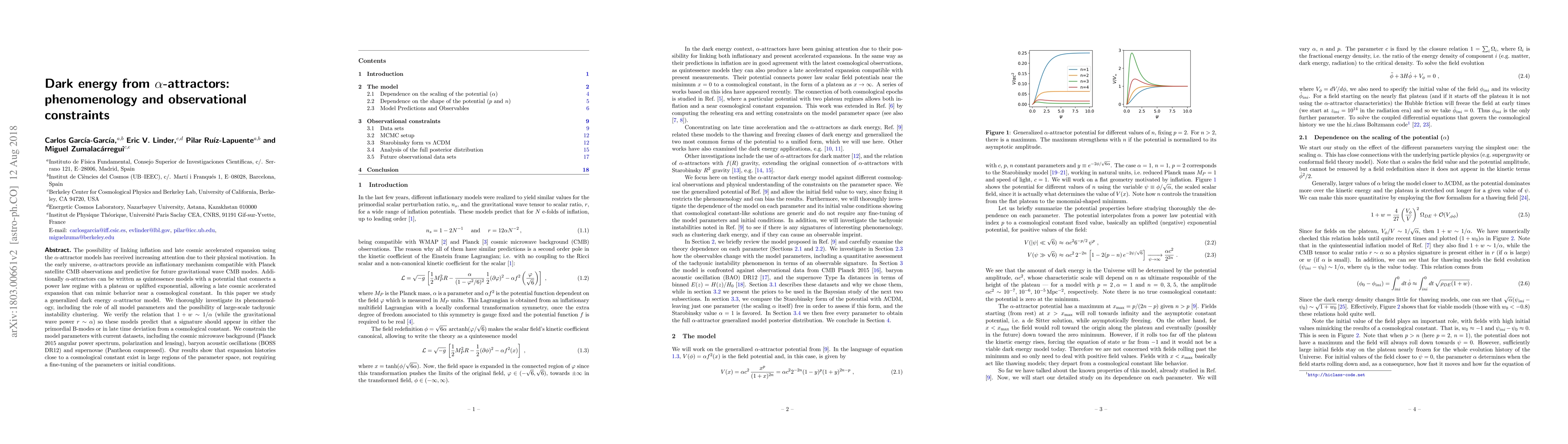 The possibility of linking inflation and late cosmic accelerated expansion using the $\alpha$-attractor models has received increasing attention due to their physical motivation. In the early universe, $\alpha$-attractors provide an inflationary mechanism compatible with Planck satellite CMB observations and predictive for future gravitational wave CMB modes. Additionally $\alpha$-attractors can be written as quintessence models with a potential that connects a power law regime with a plateau or uplifted exponential, allowing a late cosmic accelerated expansion that can mimic behavior near a cosmological constant. In this paper we study a generalized dark energy $\alpha$-attractor model. We thoroughly investigate its phenomenology, including the role of all model parameters and the possibility of large-scale tachyonic instability clustering. We verify the relation that $1+w\sim 1/\alpha$ (while the gravitational wave power $r\sim\alpha$) so these models predict that a signature should appear in either the primordial B-modes or in late time deviation from a cosmological constant. We constrain the model parameters with current datasets, including the cosmic microwave background (Planck 2015 angular power spectrum, polarization and lensing), baryon acoustic oscillations (BOSS DR12) and supernovae (Pantheon compressed). Our results show that expansion histories close to a cosmological constant exist in large regions of the parameter space, not requiring a fine-tuning of the parameters or initial conditions.