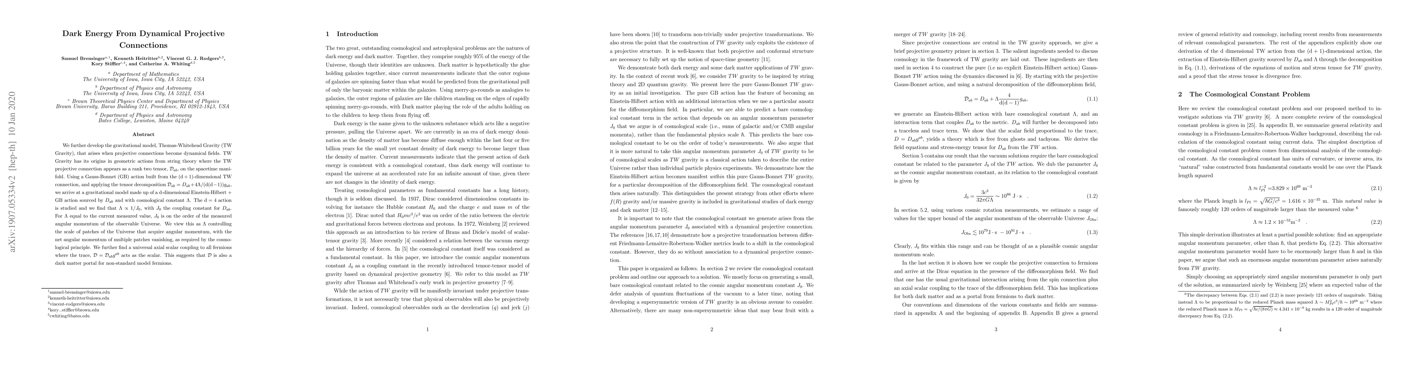 We further develop the gravitational model, Thomas-Whitehead Gravity (TW Gravity), that arises when projective connections become dynamical fields. TW Gravity has its origins in geometric actions from string theory where the TW projective connection appears as a rank two tensor, $\mathcal{D}_{ab}$, on the spacetime manifold. Using a Gauss-Bonnet (GB) action built from the $(\mathrm{d}+1)$-dimensional TW connection, and applying the tensor decomposition $\mathcal{D}_{ab} = D_{ab} + 4\Lambda /(\mathrm{d}(\mathrm{d}-1)) g_{ab}$, we arrive at a gravitational model made up of a $\mathrm{d}$-dimensional Einstein-Hilbert + GB action sourced by $D_{ab}$ and with cosmological constant $\Lambda$. The $\mathrm{d}=4$ action is studied and we find that $\Lambda \propto 1/J_0$, with $J_0$ the coupling constant for $D_{ab}$. For $\Lambda$ equal to the current measured value, $J_0$ is on the order of the measured angular momentum of the observable Universe. We view this as $\Lambda$ controlling the scale of patches of the Universe that acquire angular momentum, with the net angular momentum of multiple patches vanishing, as required by the cosmological principle. We further find a universal axial scalar coupling to all fermions where the trace, $\mathcal{D} = \mathcal{D}_{ab}g^{ab}$ acts as the scalar. This suggests that $\mathcal{D}$ is also a dark matter portal for non-standard model fermions.