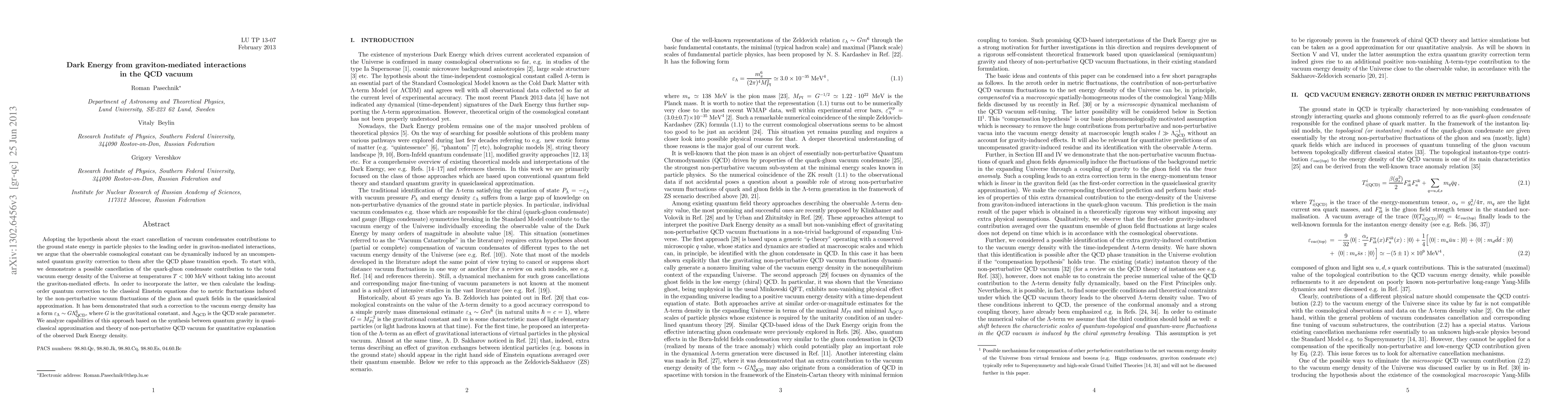 Adopting the hypothesis about the exact cancellation of vacuum condensates contributions to the ground state energy in particle physics to the leading order in graviton-mediated interactions, we argue that the observable cosmological constant can be dynamically induced by an uncompensated quantum gravity correction to them after the QCD phase transition epoch. To start with, we demonstrate a possible cancellation of the quark-gluon condensate contribution to the total vacuum energy density of the Universe at temperatures $T<100$ MeV without taking into account the graviton-mediated effects. In order to incorporate the latter, we then calculate the leading-order quantum correction to the classical Einstein equations due to metric fluctuations induced by the non-perturbative vacuum fluctuations of the gluon and quark fields in the quasiclassical approximation. It has been demonstrated that such a correction to the vacuum energy density has a form $\varepsilon_{\Lambda}\sim G \Lambda_{\rm QCD}^6$, where $G$ is the gravitational constant, and $\Lambda_{\rm QCD}$ is the QCD scale parameter. We analyze capabilities of this approach based on the synthesis between quantum gravity in quasiclassical approximation and theory of non-perturbative QCD vacuum for quantitative explanation of the observed Dark Energy density.