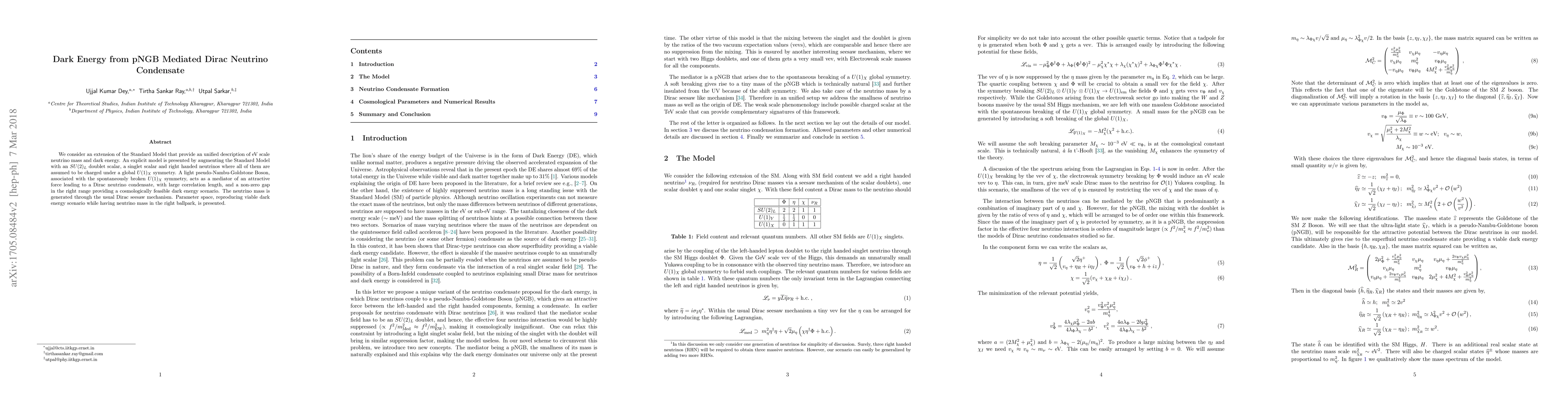 This paper proposes an extended Standard Model incorporating a $SU(2)_L$ doublet scalar, a singlet scalar, and right-handed neutrinos under a $U(1)_X$ symmetry, where a pseudo-Nambu-Goldstone boson mediates a Dirac neutrino condensate forming dark energy. The model generates eV scale neutrino masses via the Dirac seesaw mechanism.