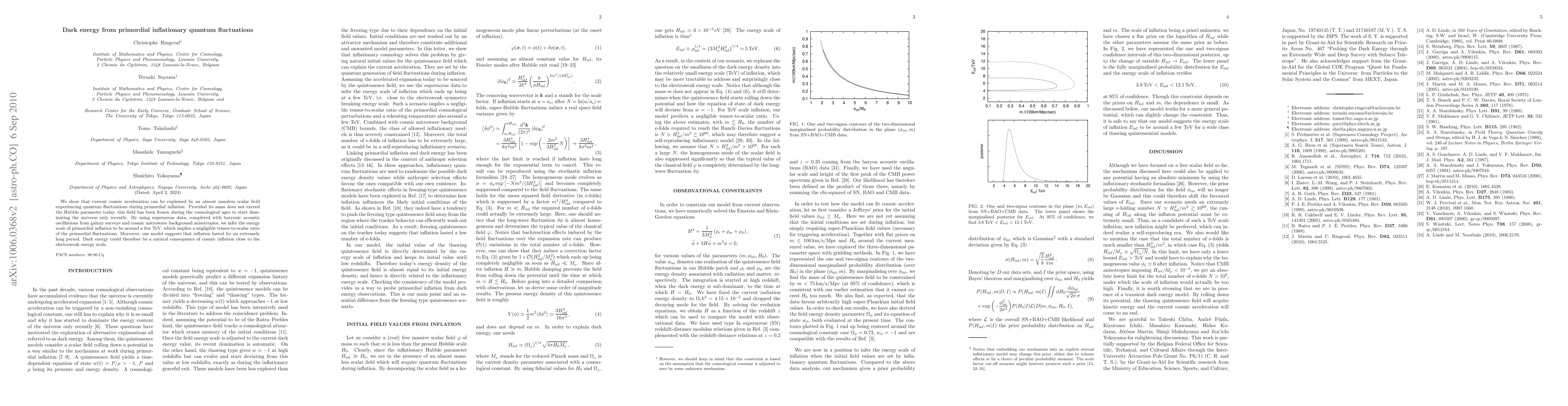 We show that current cosmic acceleration can be explained by an almost massless scalar field experiencing quantum fluctuations during primordial inflation. Provided its mass does not exceed the Hubble parameter today, this field has been frozen during the cosmological ages to start dominating the universe only recently. By using supernovae data, completed with baryonic acoustic oscillations from galaxy surveys and cosmic microwave background anisotropies, we infer the energy scale of primordial inflation to be around a few TeV, which implies a negligible tensor-to-scalar ratio of the primordial fluctuations. Moreover, our model suggests that inflation lasted for an extremely long period. Dark energy could therefore be a natural consequence of cosmic inflation close to the electroweak energy scale.
