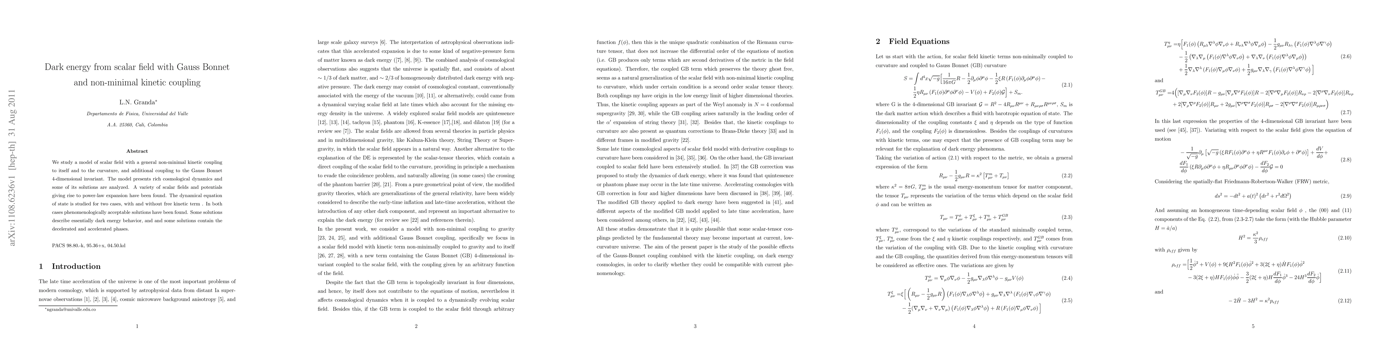 This paper explores a scalar field model with non-minimal kinetic coupling and Gauss Bonnet coupling, revealing rich cosmological dynamics and power-law expansion solutions. It finds phenomenologically acceptable dark energy behaviors and both decelerated and accelerated phases in the model's solutions.