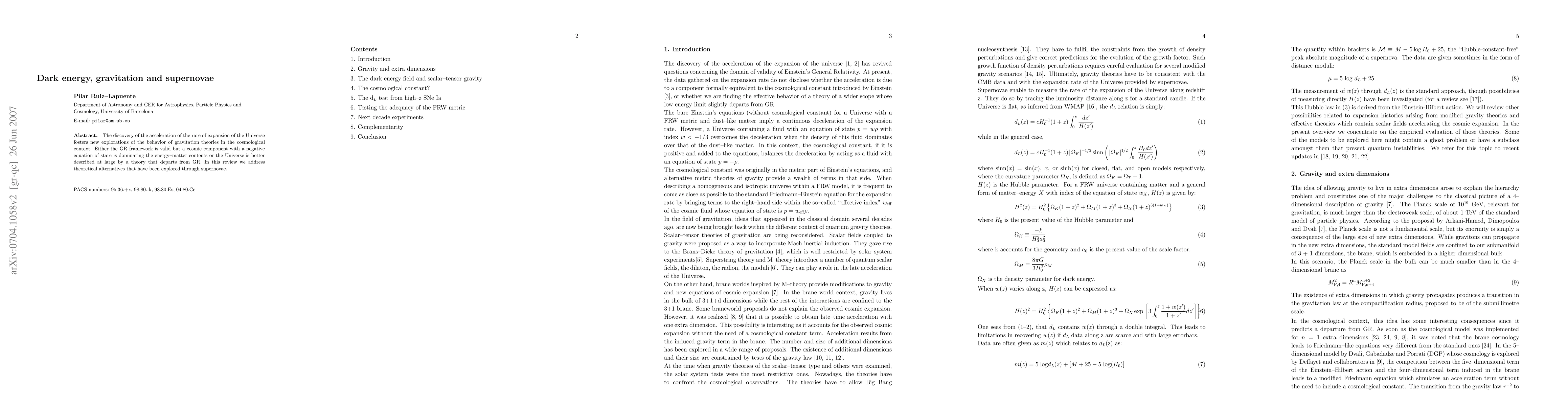 The discovery of the acceleration of the rate of expansion of the Universe fosters new explorations of the behavior of gravitation theories in the cosmological context. Either the GR framework is valid but a cosmic component with a negative equation of state is dominating the energy--matter contents or the Universe is better described at large by a theory that departs from GR. In this review we address theoretical alternatives that have been explored through supernovae.