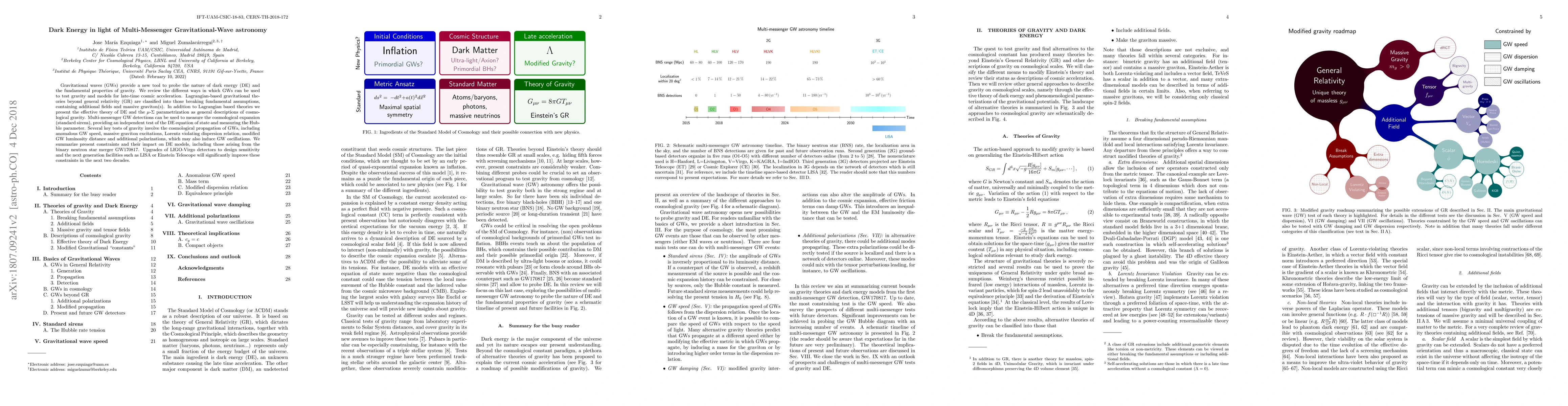 Gravitational waves (GWs) provide a new tool to probe the nature of dark energy (DE) and the fundamental properties of gravity. We review the different ways in which GWs can be used to test gravity and models for late-time cosmic acceleration. Lagrangian-based gravitational theories beyond general relativity (GR) are classified into those breaking fundamental assumptions, containing additional fields and massive graviton(s). In addition to Lagrangian based theories we present the effective theory of DE and the $\mu$-$\Sigma$ parametrization as general descriptions of cosmological gravity. Multi-messenger GW detections can be used to measure the cosmological expansion (standard sirens), providing an independent test of the DE equation of state and measuring the Hubble parameter. Several key tests of gravity involve the cosmological propagation of GWs, including anomalous GW speed, massive graviton excitations, Lorentz violating dispersion relation, modified GW luminosity distance and additional polarizations, which may also induce GW oscillations. We summarize present constraints and their impact on DE models, including those arising from the binary neutron star merger GW170817. Upgrades of LIGO-Virgo detectors to design sensitivity and the next generation facilities such as LISA or Einstein Telescope will significantly improve these constraints in the next two decades.