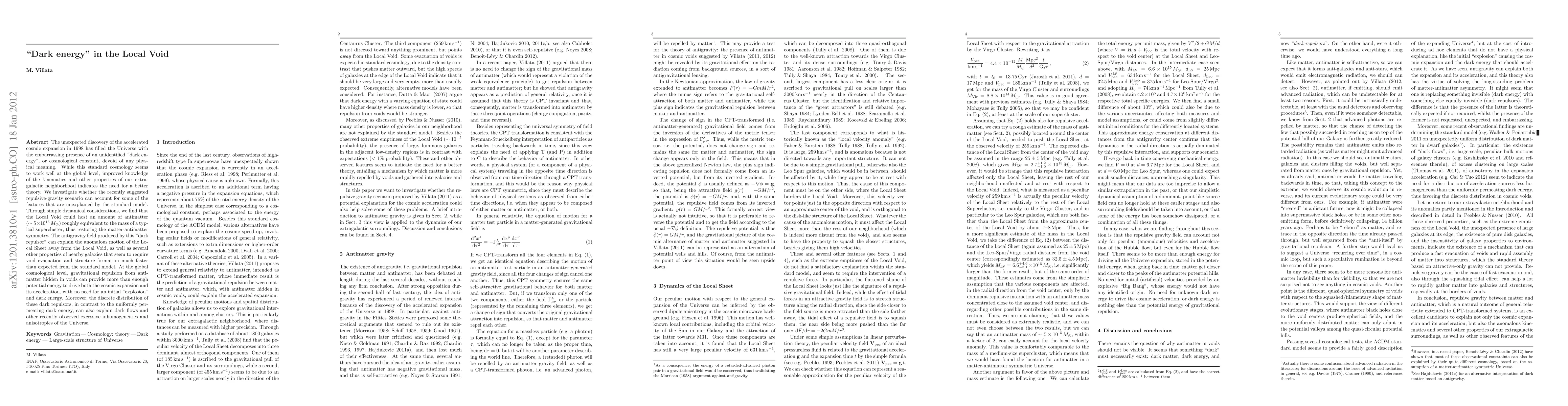 This paper explores an alternative to dark energy by proposing that the Local Void contains a significant amount of antimatter, which generates a repulsive gravitational force. This antigravity effect could explain the accelerated cosmic expansion and other anomalies without requiring dark energy, suggesting a more localized and discrete source of gravitational repulsion.