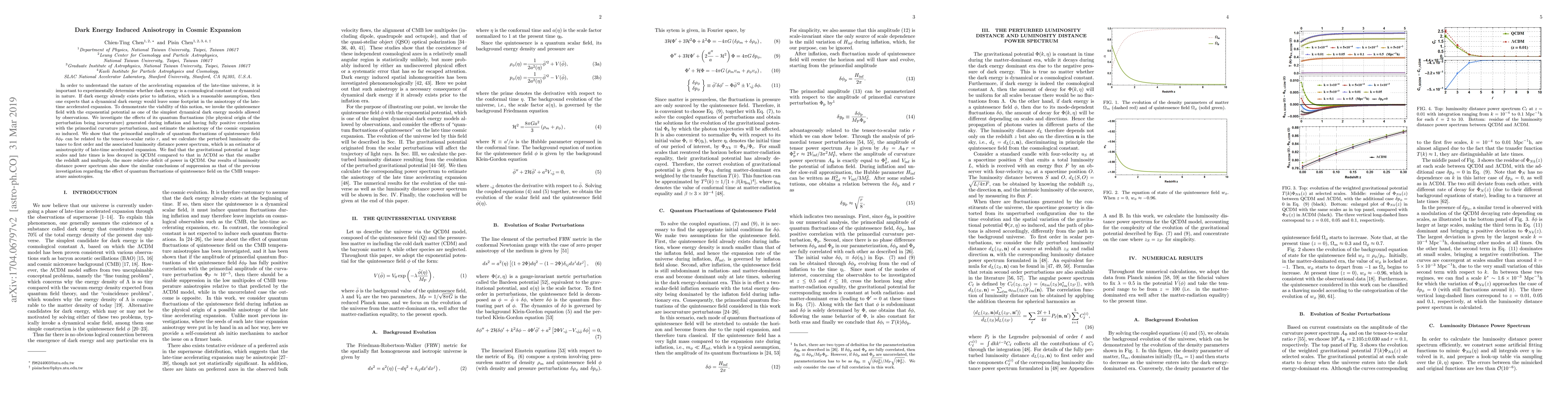 Researchers investigate the impact of dark energy's dynamical nature on cosmic expansion, finding that quantum fluctuations in a quintessence field can induce anisotropy in late-time acceleration, which is more pronounced at smaller redshifts and lower multipole numbers.