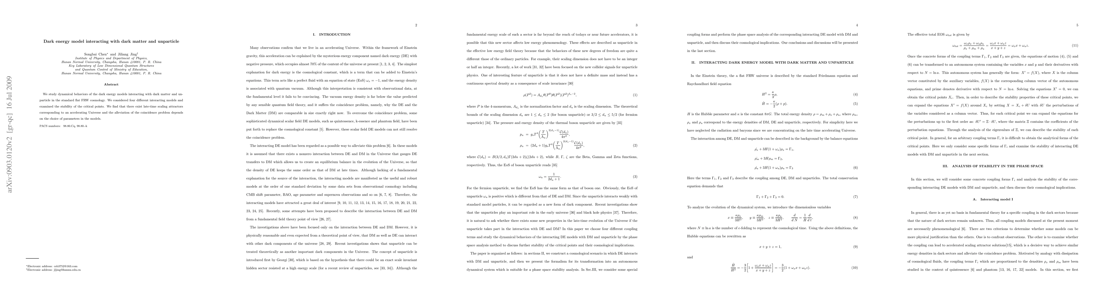 This paper investigates the dynamics of dark energy models interacting with dark matter and unparticles in a standard flat FRW cosmology, finding late-time scaling attractors that support an accelerating universe, with the alleviation of the coincidence problem varying by model parameters.