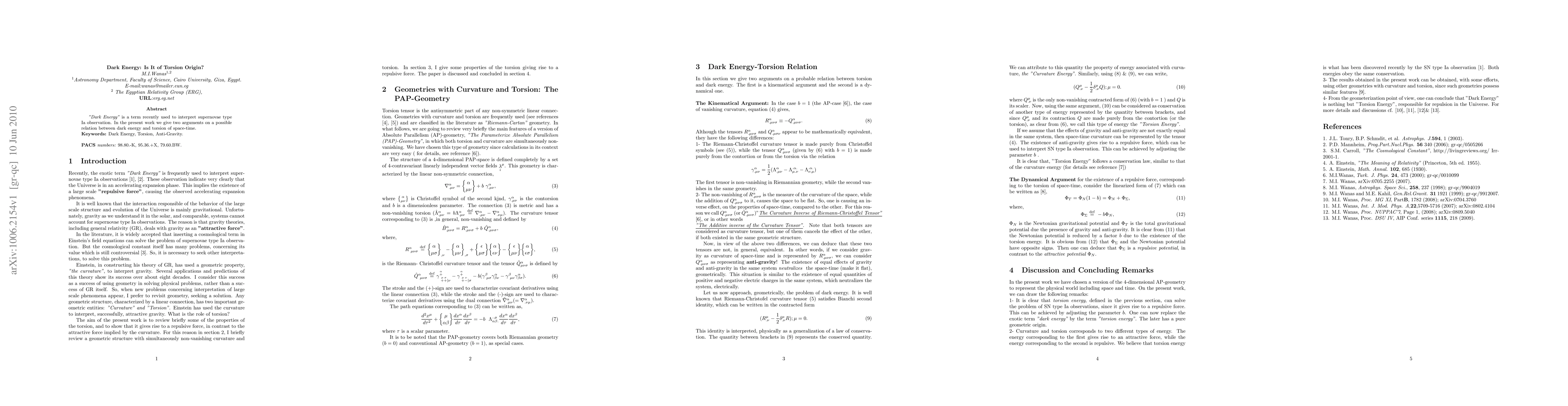 Summary: This paper explores the potential connection between dark energy, inferred from supernovae type Ia observations, and the torsion of space-time, suggesting two arguments for a possible origin of dark energy in torsional effects.