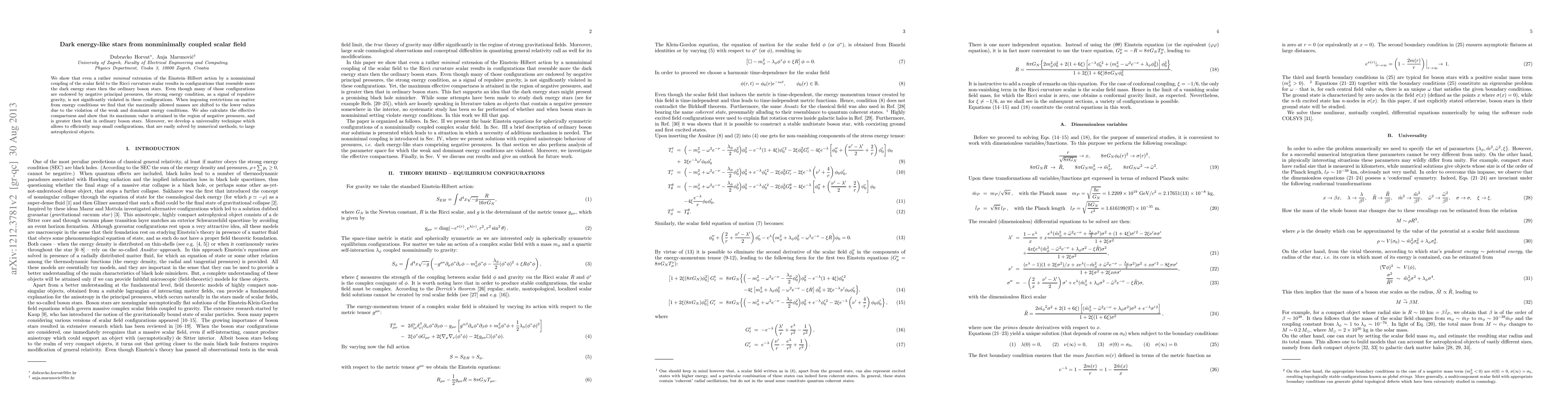 We show that even a rather minimal extension of the Einstein - Hilbert action by a nonminimal coupling of the scalar field to the Ricci curvature scalar results in configurations that resemble more the dark energy stars then the ordinary boson stars. Even though many of those configurations are endowed by negative principal pressures, the strong energy condition, as a signal of repulsive gravity, is not significantly violated in these configurations. When imposing restrictions on matter from energy conditions we find that the maximally allowed masses are shifted to the lower values due to the violation of the weak and dominant energy conditions. We also calculate the effective compactness and show that its maximum value is attained in the region of negative pressures, and is greater then that in ordinary boson stars. Moreover, we develop a universality technique which allows to efficiently map small configurations, that are easily solved by numerical methods, to large astrophysical objects.