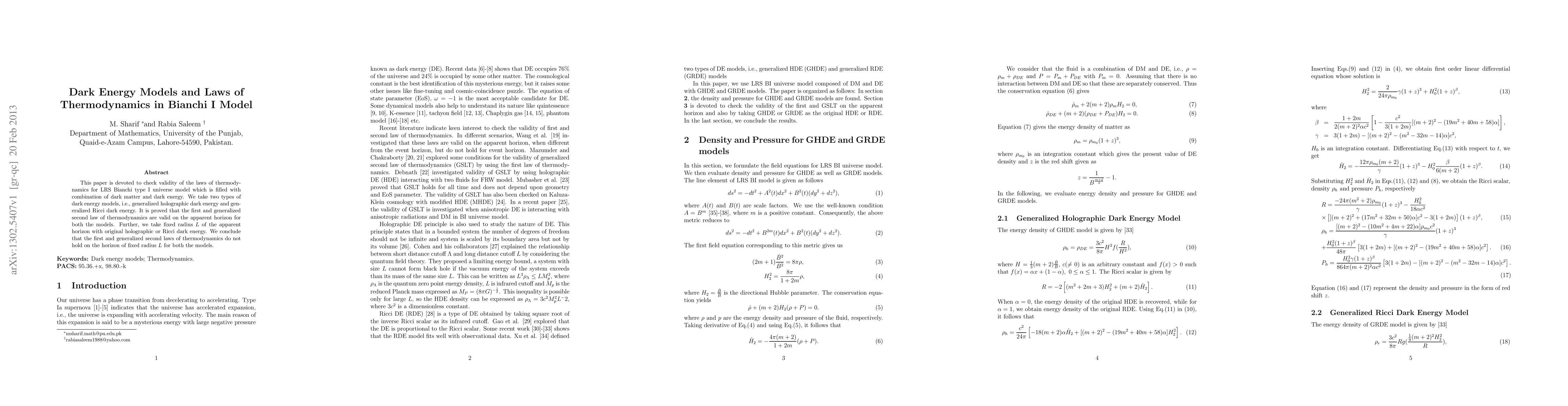 This paper is devoted to check validity of the laws of thermodynamics for LRS Bianchi type I universe model which is filled with combination of dark matter and dark energy. We take two types of dark energy models, i.e., generalized holographic dark energy and generalized Ricci dark energy. It is proved that the first and generalized second law of thermodynamics are valid on the apparent horizon for both the models. Further, we take fixed radius $L$ of the apparent horizon with original holographic or Ricci dark energy. We conclude that the first and generalized second laws of thermodynamics do not hold on the horizon of fixed radius $L$ for both the models.