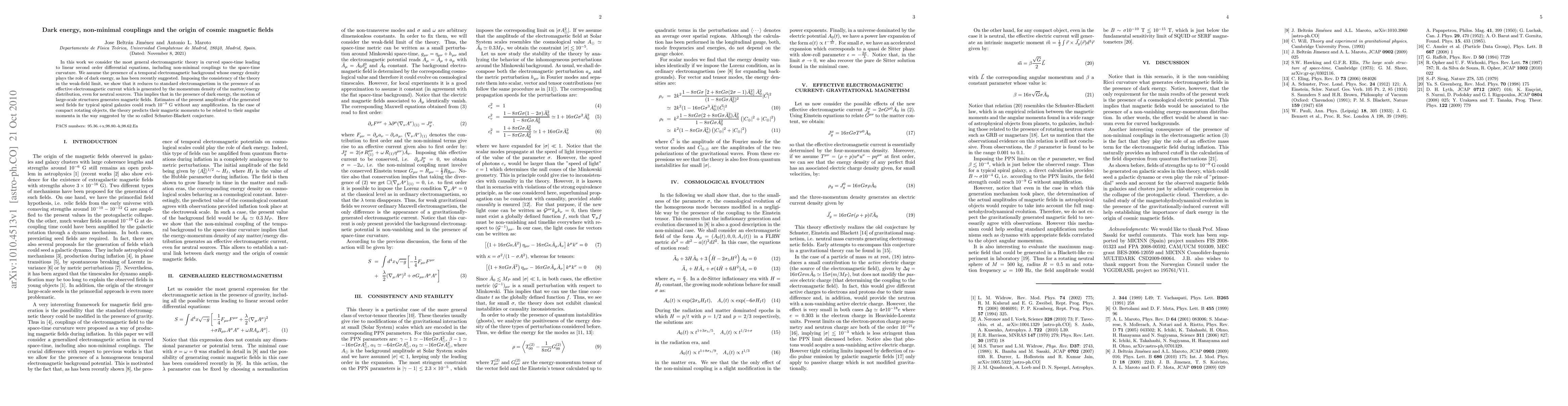 In this work we consider the most general electromagnetic theory in curved space-time leading to linear second order differential equations, including non-minimal couplings to the space-time curvature. We assume the presence of a temporal electromagnetic background whose energy density plays the role of dark energy, as has been recently suggested. Imposing the consistency of the theory in the weak-field limit, we show that it reduces to standard electromagnetism in the presence of an effective electromagnetic current which is generated by the momentum density of the matter/energy distribution, even for neutral sources. This implies that in the presence of dark energy, the motion of large-scale structures generates magnetic fields. Estimates of the present amplitude of the generated seed fields for typical spiral galaxies could reach $10^{-9}$ G without any amplification. In the case of compact rotating objects, the theory predicts their magnetic moments to be related to their angular momenta in the way suggested by the so called Schuster-Blackett conjecture.