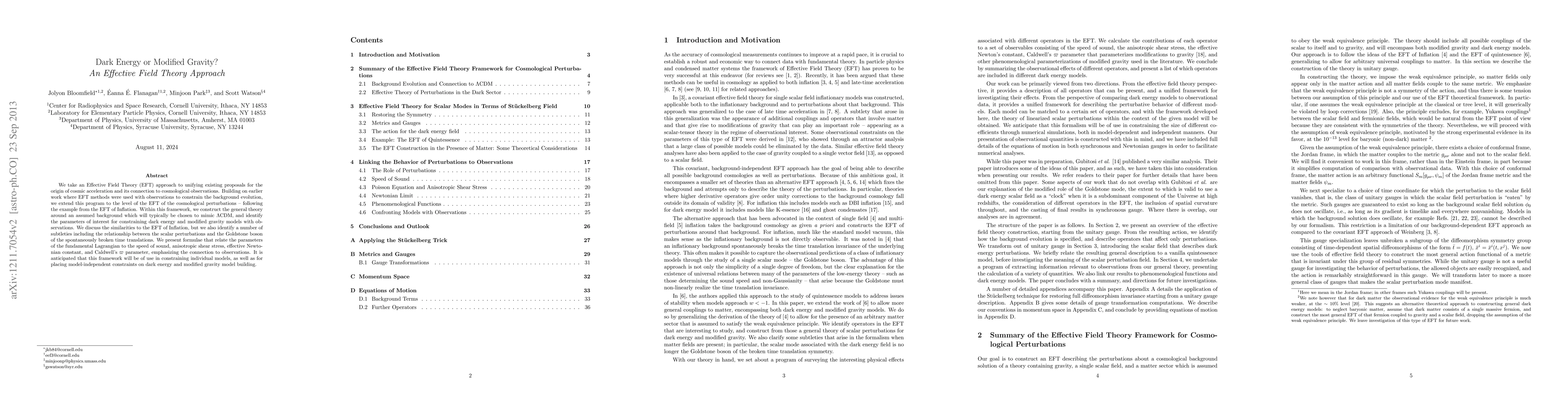 This paper employs an Effective Field Theory (EFT) approach to explore cosmic acceleration, comparing dark energy and modified gravity models. It constructs a general theory for cosmological perturbations, identifying parameters for constraining these models, and presents formulae linking fundamental Lagrangian parameters to observational quantities.
