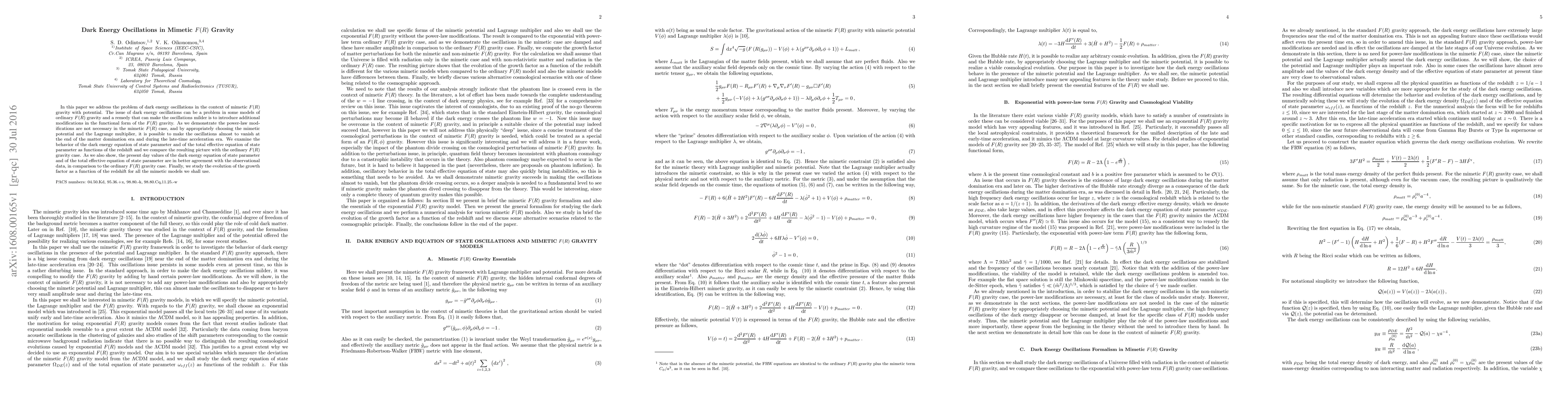 In this paper we address the problem of dark energy oscillations in the context of mimetic $F(R)$ gravity with potential. The issue of dark energy oscillations can be a problem in some models of ordinary $F(R)$ gravity and a remedy that can make the oscillations milder is to introduce additional modifications in the functional form of the $F(R)$ gravity. As we demonstrate the power-law modifications are not necessary in the mimetic $F(R)$ case, and by appropriately choosing the mimetic potential and the Lagrange multiplier, it is possible to make the oscillations almost to vanish at the end of the matter domination era and during the late-time acceleration era. We examine the behavior of the dark energy equation of state parameter and of the total effective equation of state parameter as functions of the redshift and we compare the resulting picture with the ordinary $F(R)$ gravity case. As we also show, the present day values of the dark energy equation of state parameter and of the total effective equation of state parameter are in better agreement with the observational data, in comparison to the ordinary $F(R)$ gravity case. Finally, we study the evolution of the growth factor as a function of the redshift for all the mimetic models we shall use.