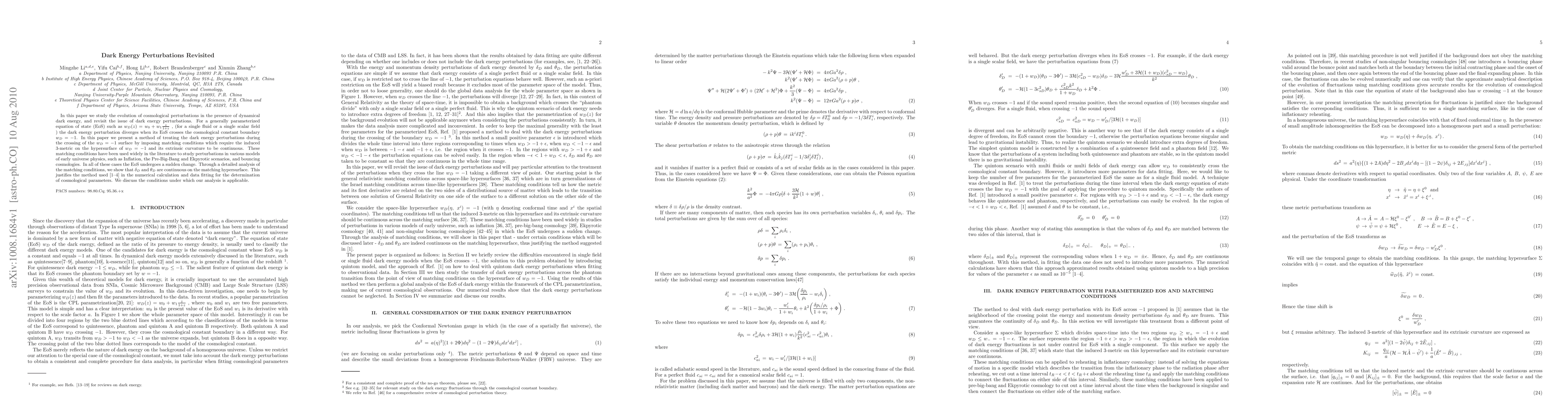 In this paper we study the evolution of cosmological perturbations in the presence of dynamical dark energy, and revisit the issue of dark energy perturbations. For a generally parameterized equation of state (EoS) such as w_D(z) = w_0+w_1\frac{z}{1+z}, (for a single fluid or a single scalar field ) the dark energy perturbation diverges when its EoS crosses the cosmological constant boundary w_D=-1. In this paper we present a method of treating the dark energy perturbations during the crossing of the $w_D=-1$ surface by imposing matching conditions which require the induced 3-metric on the hypersurface of w_D=-1 and its extrinsic curvature to be continuous. These matching conditions have been used widely in the literature to study perturbations in various models of early universe physics, such as Inflation, the Pre-Big-Bang and Ekpyrotic scenarios, and bouncing cosmologies. In all of these cases the EoS undergoes a sudden change. Through a detailed analysis of the matching conditions, we show that \delta_D and \theta_D are continuous on the matching hypersurface. This justifies the method used[1-4] in the numerical calculation and data fitting for the determination of cosmological parameters. We discuss the conditions under which our analysis is applicable.