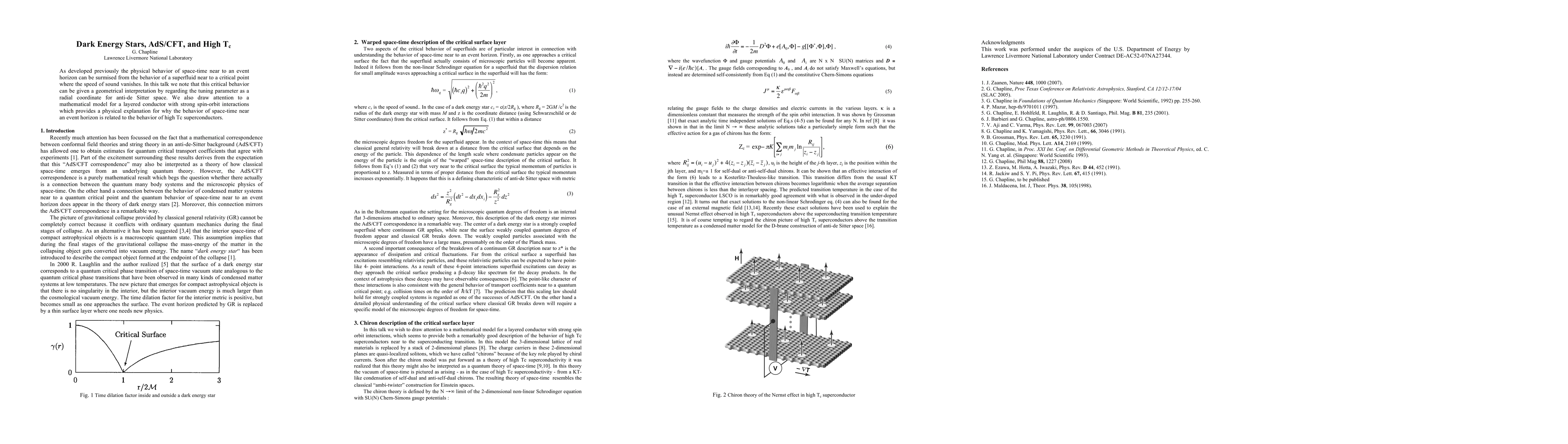 As developed previously the physical behavior of space-time near to an event horizon can be surmised from the behavior of a superfluid near to a critical point where the speed of sound vanishes. In this talk we note that this critical behavior can be given a geometrical interpretation by regarding the tuning parameter as a radial coordinate for anti-de Sitter space. We also draw attention to a mathematical model for a layered conductor with strong spin-orbit interactions which provides a physical explanation for why the behavior of space-time near an event horizon is related to the behavior of high Tc superconductors.