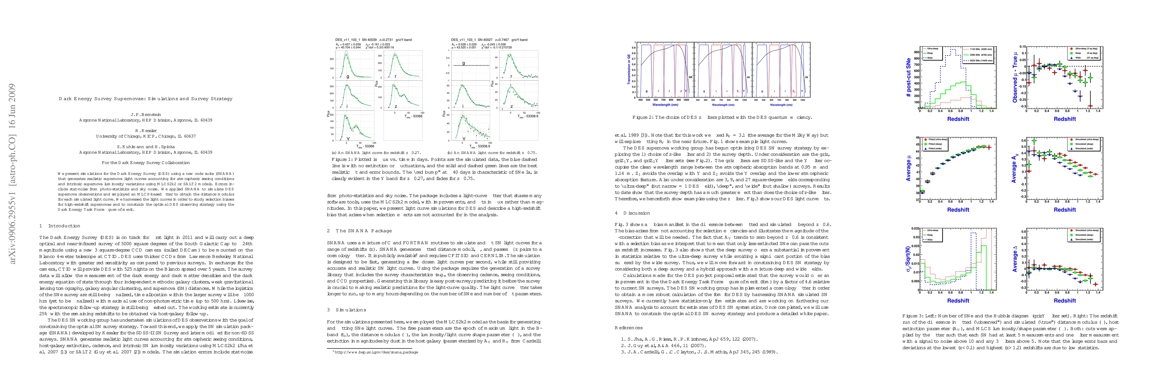 This paper presents simulations for the Dark Energy Survey using the SNANA code, which models supernova light curves considering atmospheric conditions and luminosity variations. The study evaluates the optimal survey strategy for detecting high-redshift supernovae and constraining the survey's figure of merit.