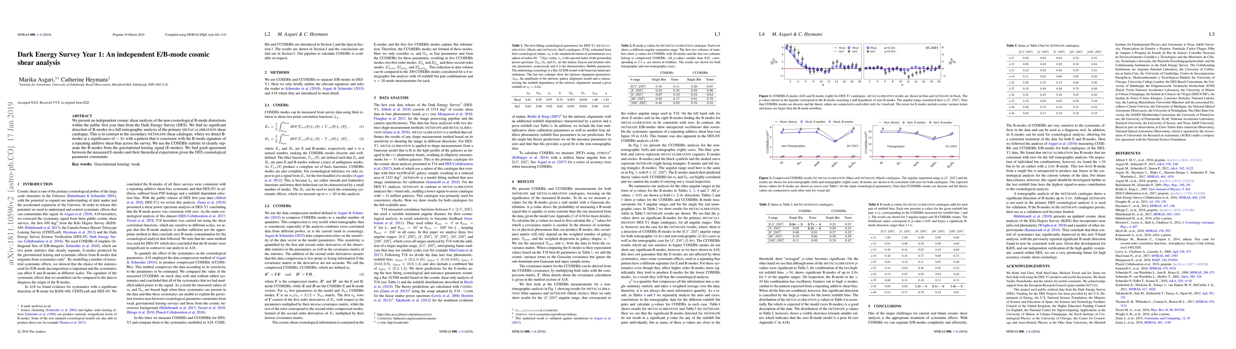 The Dark Energy Survey Year 1 provides an independent analysis of cosmic shear, finding no significant detection of B-modes in the primary catalogue but detecting B-modes at $\sim 3\sigma$ in the secondary catalogue, likely due to additive shear bias. The E-modes align well with theoretical predictions.