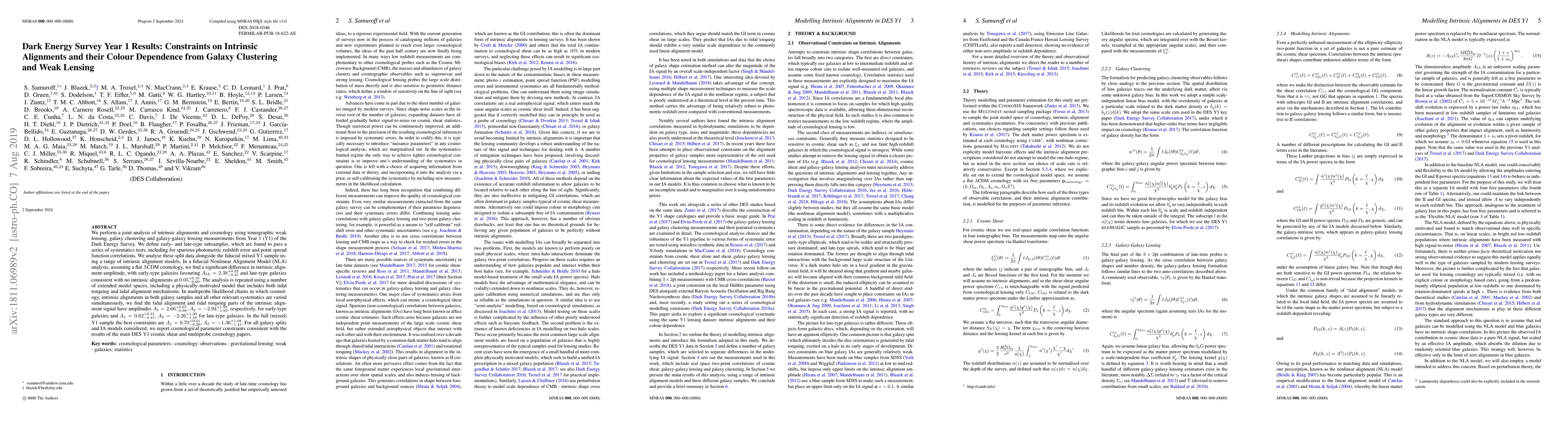 The Dark Energy Survey Year 1 results reveal significant differences in intrinsic alignments between early-type and late-type galaxies, with early-type galaxies showing a strong alignment signal while late-type galaxies exhibit negligible alignment. The study also finds weak evidence of alignment amplitude diminishing with higher redshifts in early-type galaxies.