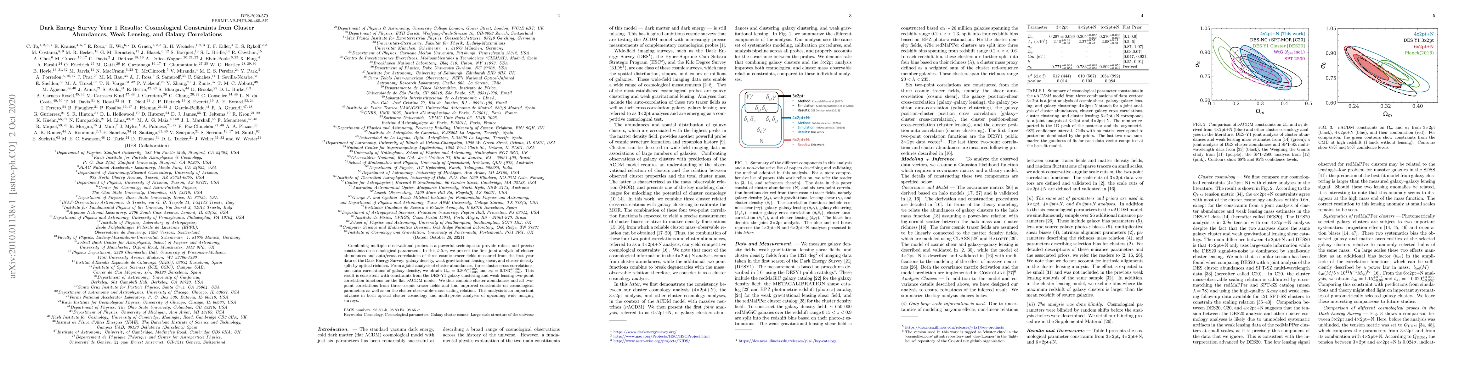The Dark Energy Survey Year 1 results provide robust constraints on cosmological parameters by combining cluster abundances, weak lensing, and galaxy correlations, yielding $\Omega_{\rm{m}}=0.305^{+0.055}_{-0.038}$ and $\sigma_8=0.783^{+0.064}_{-0.054}$, consistent with the flat $\nu\Lambda$CDM model. This joint analysis enhances the precision of cosmological parameter estimates and cluster mass scaling relations.