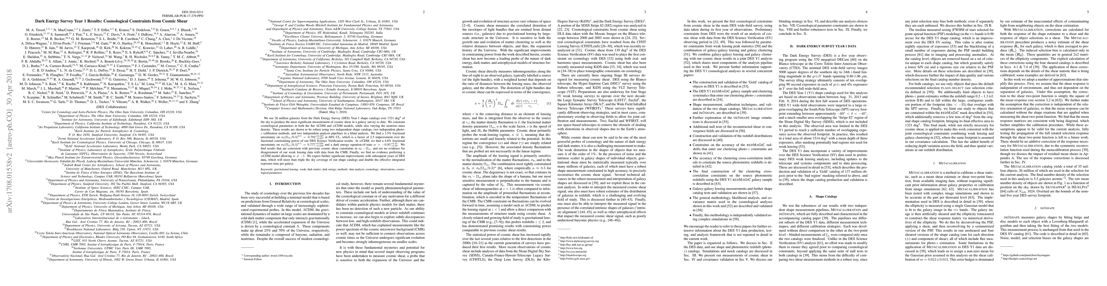 The Dark Energy Survey Year 1 results provide the most precise measurement of cosmic shear to date, using 26 million galaxies over 1321 deg$^2$. The study constrains cosmological parameters in $\Lambda$CDM and $w$CDM models, achieving a 3.5% fractional uncertainty on $\sigma_8(\Omega_m/0.3)^{0.5}$, and finds no evidence for a dark energy equation-of-state differing from $-1$.