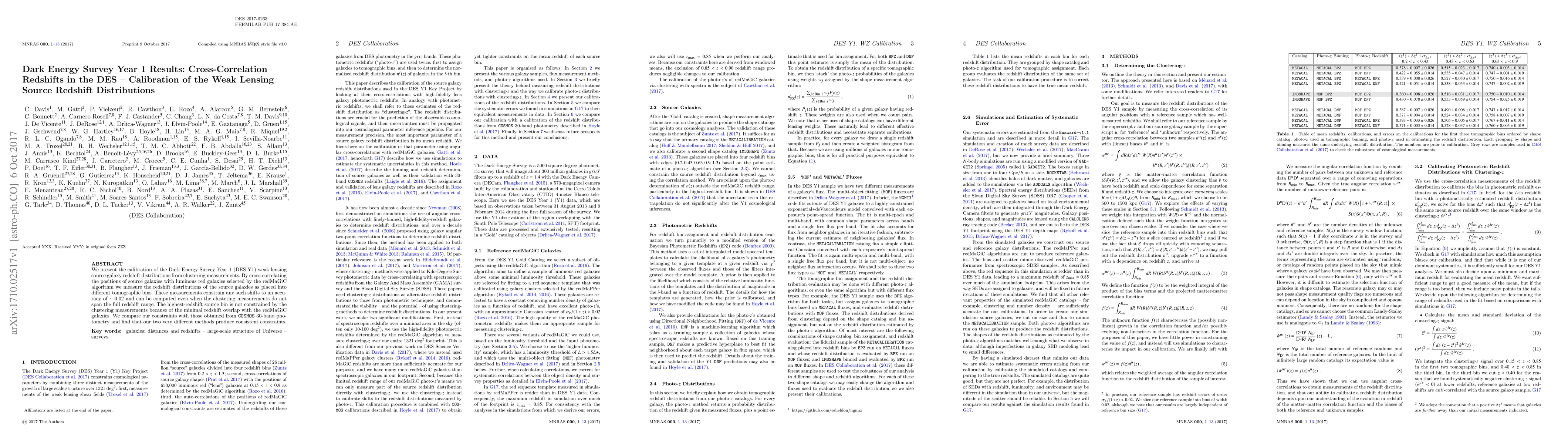 The Dark Energy Survey Year 1 (DES Y1) calibrated the weak lensing source galaxy redshift distributions using cross-correlation with luminous red galaxies. The method constrains redshift shifts to an accuracy of $\sim0.02$, showing consistency with independent $\texttt{COSMOS}$ 30-band photometry results.