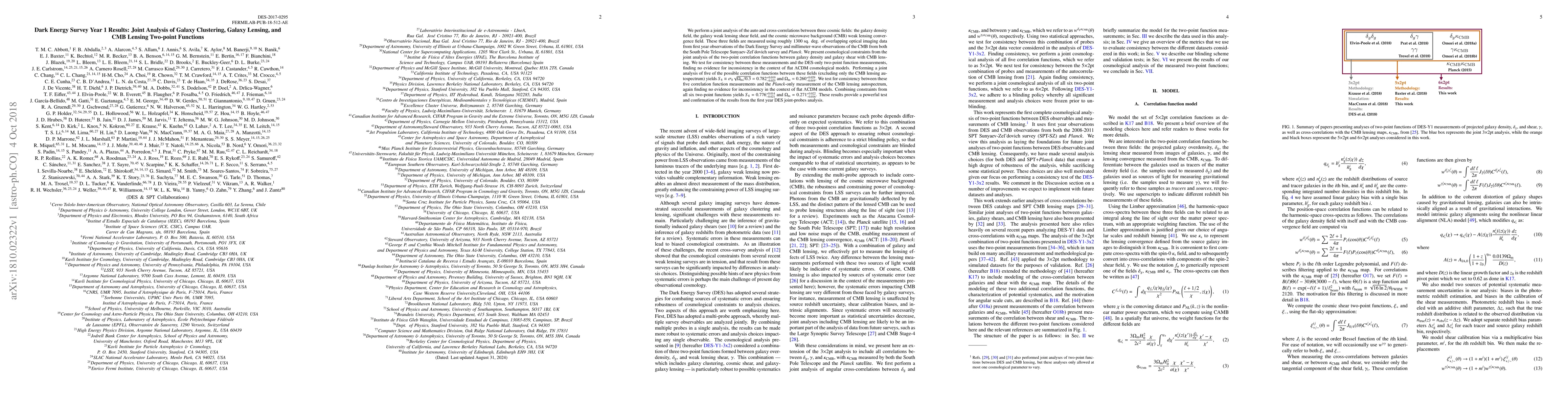 The Dark Energy Survey Year 1 results present a joint analysis of galaxy clustering, galaxy lensing, and CMB lensing, yielding cosmological constraints that support the flat $\Lambda$CDM model. The joint analysis of five correlation functions provides $S_{8}=0.782^{+0.019}_{-0.025}$ and $\Omega_{\rm m}=0.260^{+0.029}_{-0.019}$, confirming the consistency of these measurements with the $\Lambda$CDM framework.