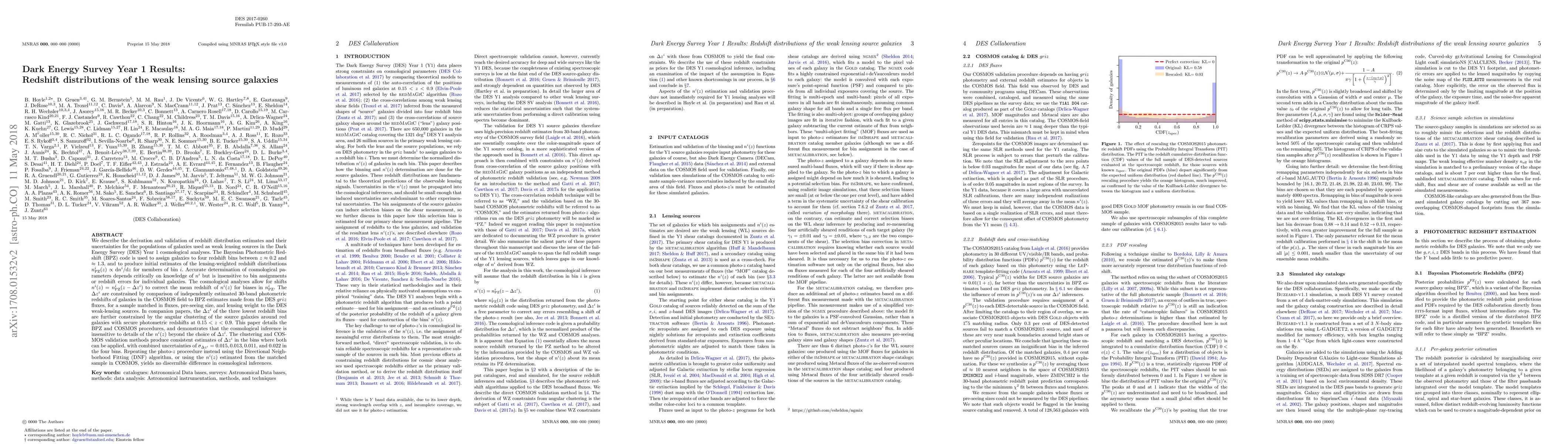 The Dark Energy Survey (DES) Year 1 results detail the derivation and validation of redshift distribution estimates for weak lensing source galaxies using the Bayesian Photometric Redshift (BPZ) code. The study finds that cosmological inferences are robust to uncertainties in the redshift distributions, with combined uncertainties of 0.015 to 0.022 in four redshift bins.
