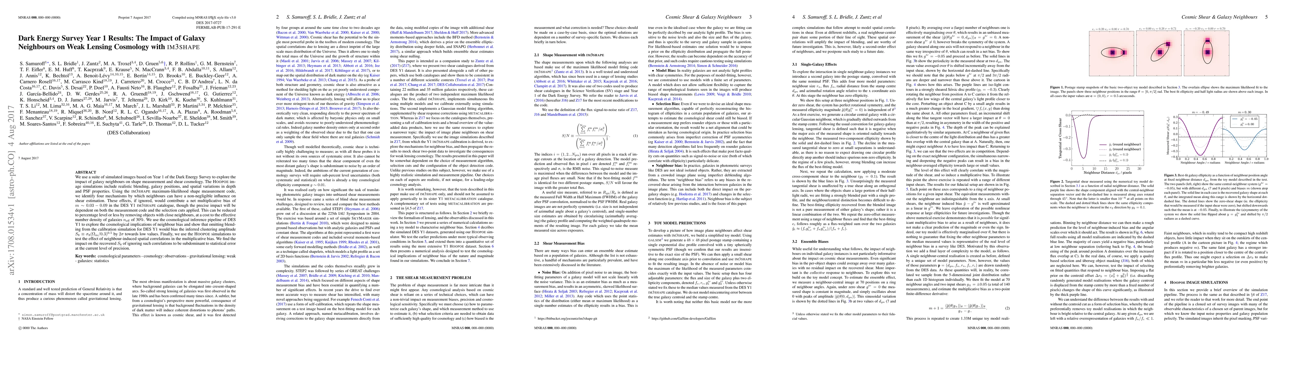 This paper investigates the impact of galaxy neighbours on weak lensing shape measurements and cosmology using the Dark Energy Survey Year 1 (DES Y1) data. It identifies four mechanisms causing non-negligible influence on shear estimation, leading to a multiplicative bias of $m \sim 0.03 - 0.09$ if ignored, which can be reduced by removing nearby galaxies but at a cost to effective galaxy density.