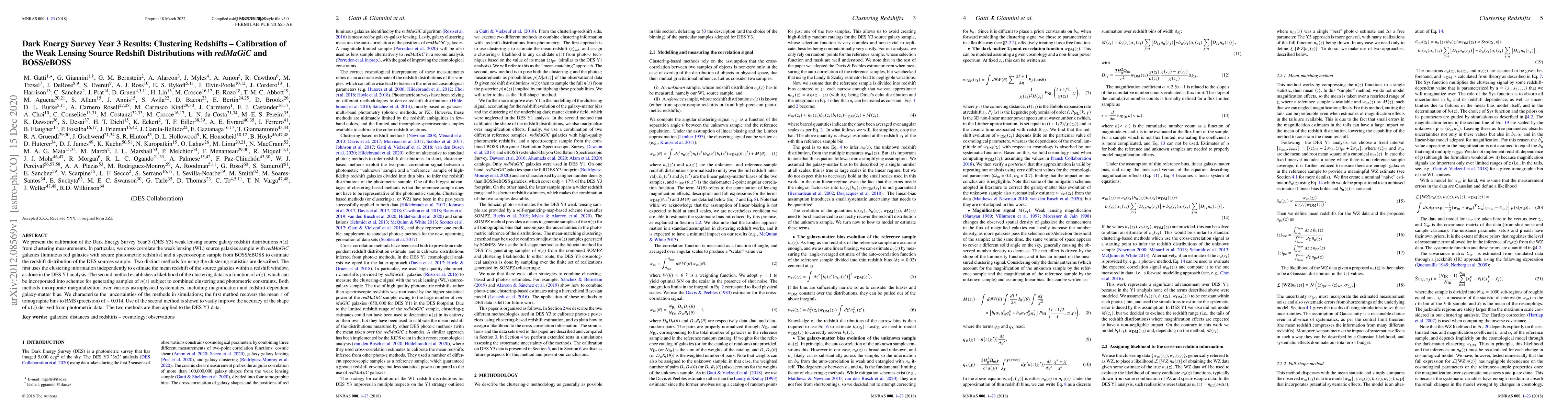 The Dark Energy Survey Year 3 results present calibration of weak lensing source galaxy redshift distributions using redMaGiC and BOSS/eBOSS. Two methods are described for estimating these distributions, with the second method significantly improving accuracy over the first.