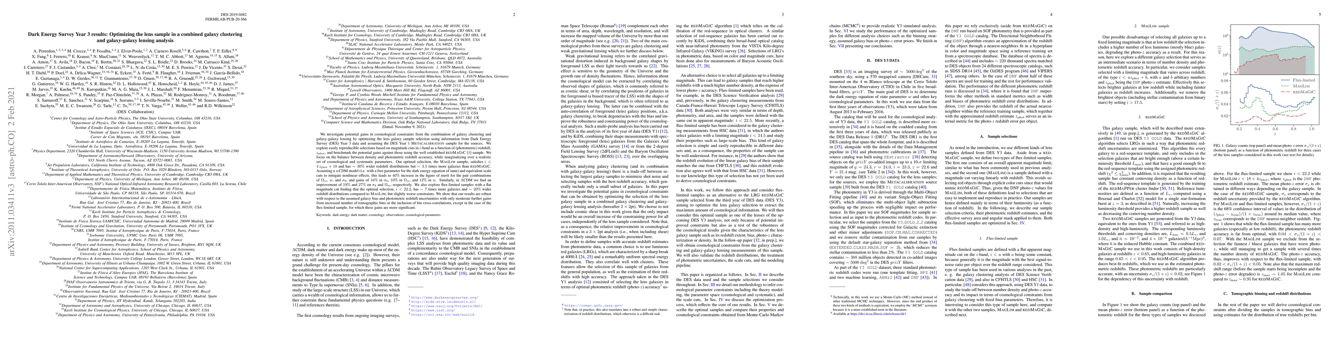 The Dark Energy Survey Year 3 results optimize lens galaxy sample selection for combined galaxy clustering and galaxy-galaxy lensing, achieving a 40% increase in figure of merit for cosmological parameters using the MagLim sample, compared to the redMaGiC sample. The flux-limited sample, while larger, yields slightly worse constraints.