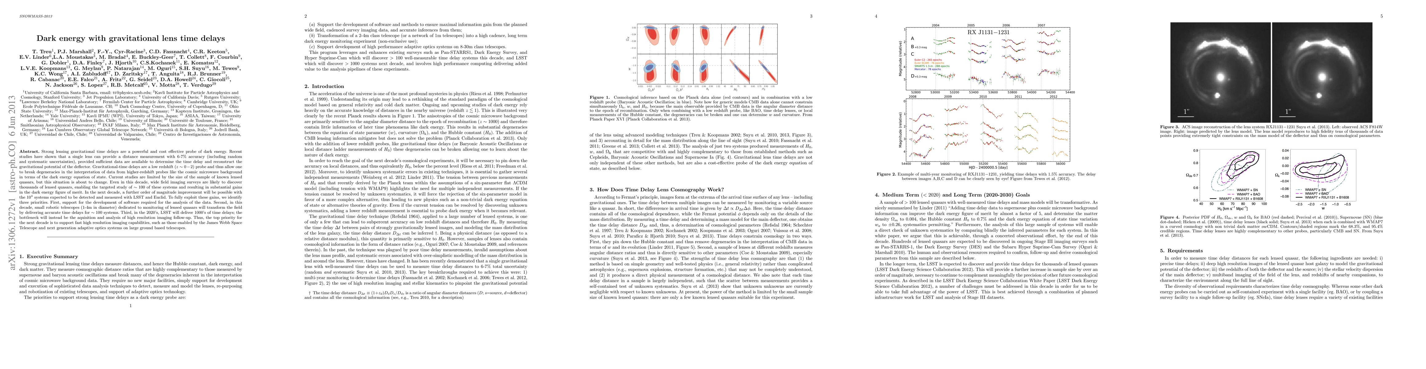 Strong lensing gravitational time delays are a powerful and cost effective probe of dark energy. Recent studies have shown that a single lens can provide a distance measurement with 6-7 % accuracy (including random and systematic uncertainties), provided sufficient data are available to determine the time delay and reconstruct the gravitational potential of the deflector. Gravitational-time delays are a low redshift (z~0-2) probe and thus allow one to break degeneracies in the interpretation of data from higher-redshift probes like the cosmic microwave background in terms of the dark energy equation of state. Current studies are limited by the size of the sample of known lensed quasars, but this situation is about to change. Even in this decade, wide field imaging surveys are likely to discover thousands of lensed quasars, enabling the targeted study of ~100 of these systems and resulting in substantial gains in the dark energy figure of merit. In the next decade, a further order of magnitude improvement will be possible with the 10000 systems expected to be detected and measured with LSST and Euclid. To fully exploit these gains, we identify three priorities. First, support for the development of software required for the analysis of the data. Second, in this decade, small robotic telescopes (1-4m in diameter) dedicated to monitoring of lensed quasars will transform the field by delivering accurate time delays for ~100 systems. Third, in the 2020's, LSST will deliver 1000's of time delays; the bottleneck will instead be the aquisition and analysis of high resolution imaging follow-up. Thus, the top priority for the next decade is to support fast high resolution imaging capabilities, such as those enabled by the James Webb Space Telescope and next generation adaptive optics systems on large ground based telescopes.