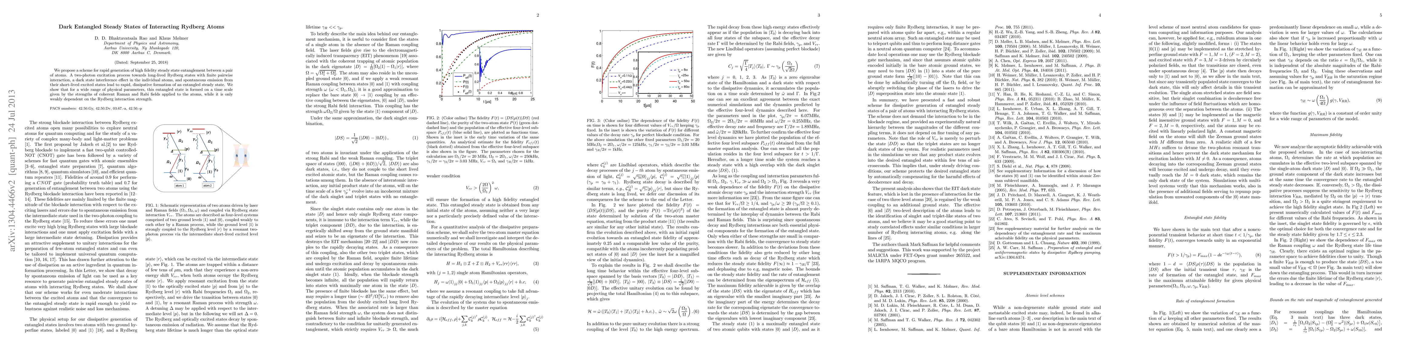 We propose a scheme for rapid generation of high fidelity steady state entanglement between a pair of atoms. A two-photon excitation process towards long-lived Rydberg states with finite pairwise interaction, a dark state interference effect in the individual atoms, and spontaneous emission from their short-lived excited states lead to rapid, dissipative formation of an entangled steady state. We show that for a wide range of physical parameters, this entangled state is formed on a time scale given by the strengths of coherent Raman and Rabi fields applied to the atoms, while it is only weakly dependent on the Rydberg interaction strength.