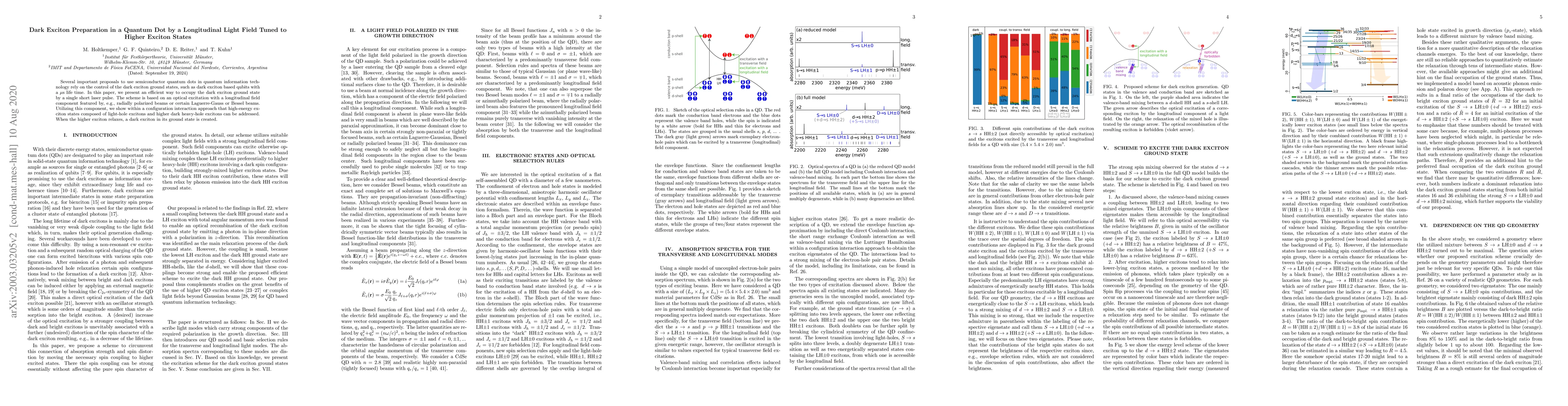 This paper proposes a method to prepare dark exciton ground states in quantum dots using a longitudinal light field, specifically radially polarized beams, to efficiently transition from higher exciton states to the dark ground state via a single short laser pulse. The technique leverages a configuration interaction approach to demonstrate the creation of dark excitons.
