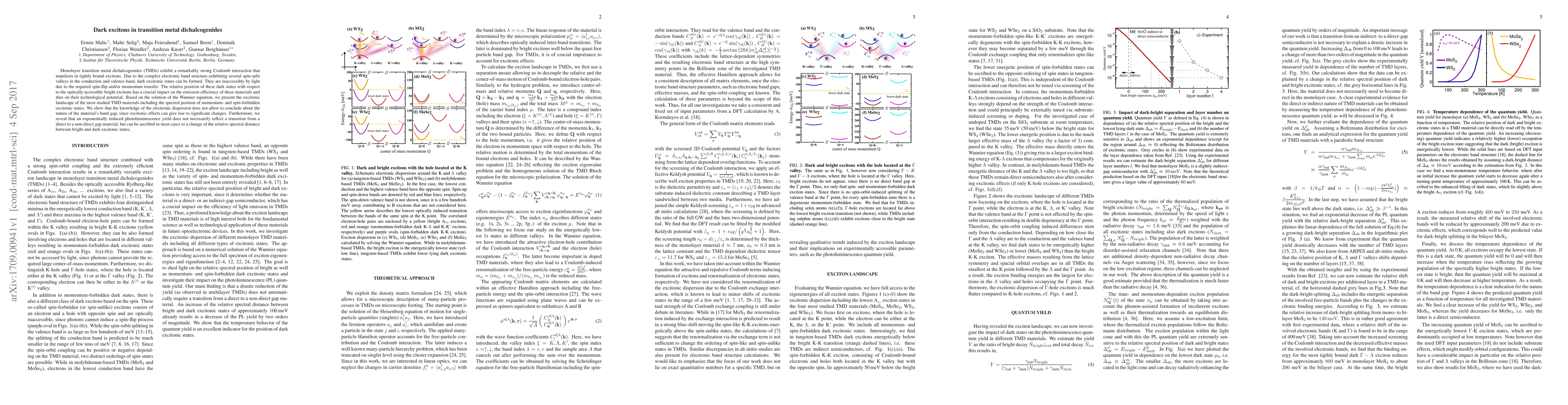 This research examines the dark excitons in monolayer transition metal dichalcogenides (TMDs), highlighting their formation due to complex electronic band structures. The study elucidates that dark excitons, which are optically inaccessible, influence the emission efficiency and technological potential of TMDs, often causing reduced photoluminescence yields due to the spectral distance from bright excitons, rather than a change in the band gap.