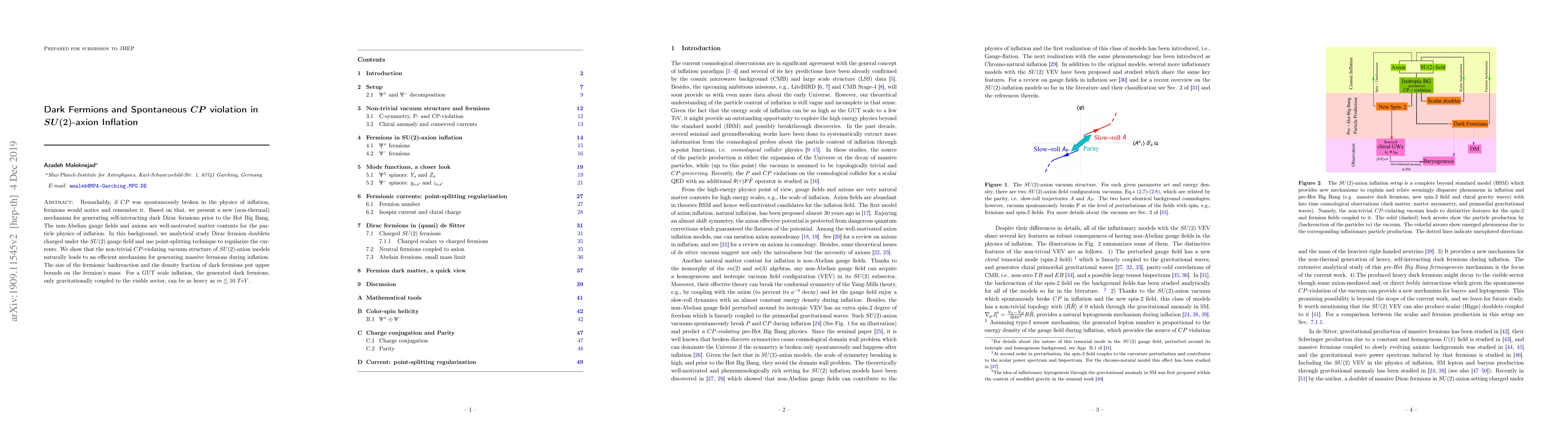 Remarkably, if $CP$ was spontaneously broken in the physics of inflation, fermions would notice and remember it. Based on that, we present a new (non-thermal) mechanism for generating self-interacting dark Dirac fermions prior to the Hot Big Bang. The non-Abelian gauge fields and axions are well-motivated matter contents for the particle physics of inflation. In this background, we analytical study Dirac fermion doublets charged under the $SU(2)$ gauge field and use point-splitting technique to regularize the currents. We show that the non-trivial $CP$-violating vacuum structure of $SU(2)$-axion models naturally leads to an efficient mechanism for generating massive fermions during inflation. The size of the fermionic backreaction and the density fraction of dark fermions put upper bounds on the fermion's mass. For a GUT scale inflation, the generated dark fermions, only gravitationally coupled to the visible sector, can be as heavy as $m\lesssim 10 TeV$.