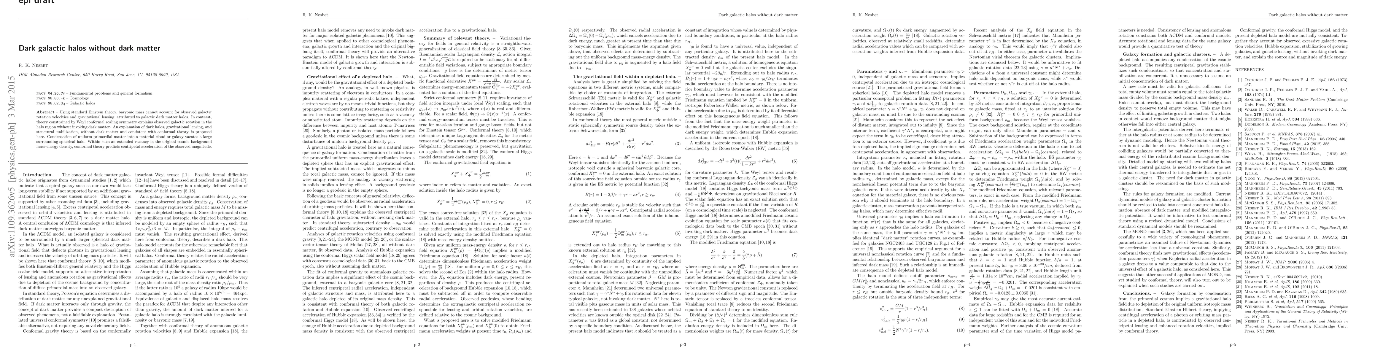 Using standard Einstein theory, baryonic mass cannot account for observed galactic rotation velocities and gravitational lensing, attributed to galactic dark matter halos. In contrast, theory constrained by Weyl conformal scaling symmetry explains observed galactic rotation in the halo region without invoking dark matter. An explanation of dark halos, gravitational lensing, and structural stabilization, without dark matter and consistent with conformal theory, is proposed here. Condensation of uniform primordial matter into a material cloud or galaxy vacates a large surrounding spherical halo. Within such an extended vacancy in the original cosmic background mass-energy density, conformal theory predicts centripetal acceleration of the observed magnitude.