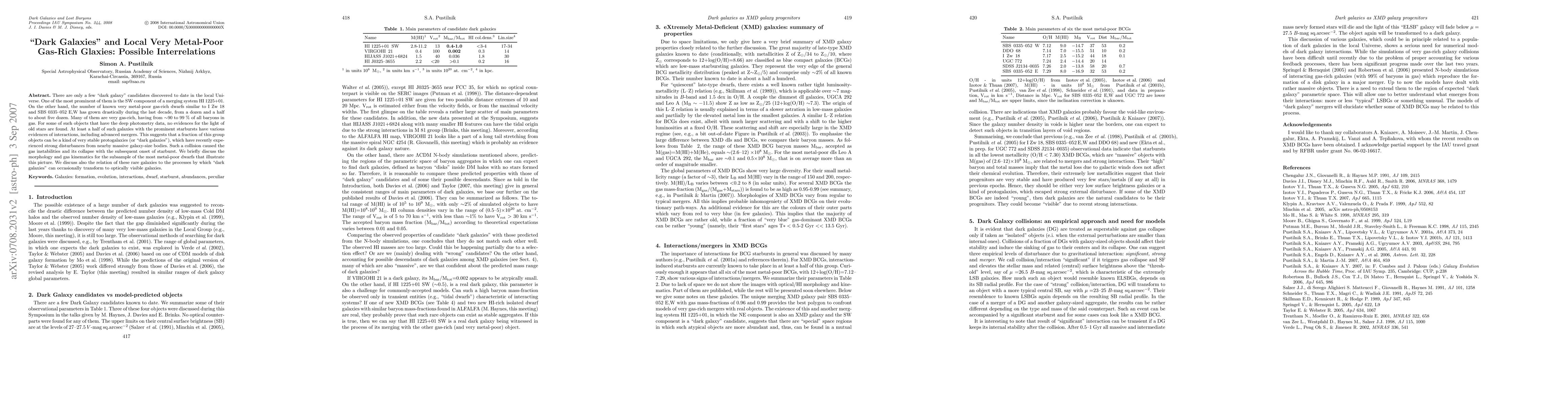 This paper explores the potential interrelations between "dark galaxies" and local very metal-poor gas-rich dwarf galaxies, suggesting that some gas-rich dwarfs may be stable protogalaxies that have recently undergone disturbances from massive bodies, leading to gas collapse and starbursts. The study discusses the morphology and gas kinematics of a subset to support this hypothesis and explores how these rare galaxies might evolve into optically visible galaxies.