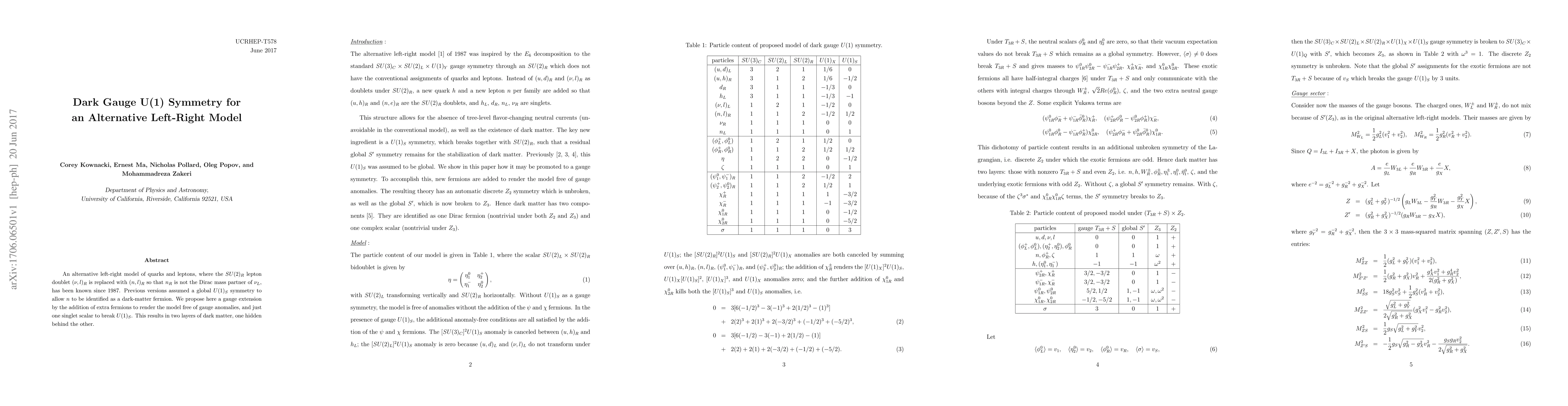 This paper proposes an alternative left-right model with a dark gauge U(1) symmetry, replacing the $SU(2)_R$ lepton doublet with $(n,l)_R$ and introducing extra fermions to eliminate gauge anomalies. A singlet scalar breaks the $U(1)_S$ symmetry, resulting in two distinct layers of dark matter.