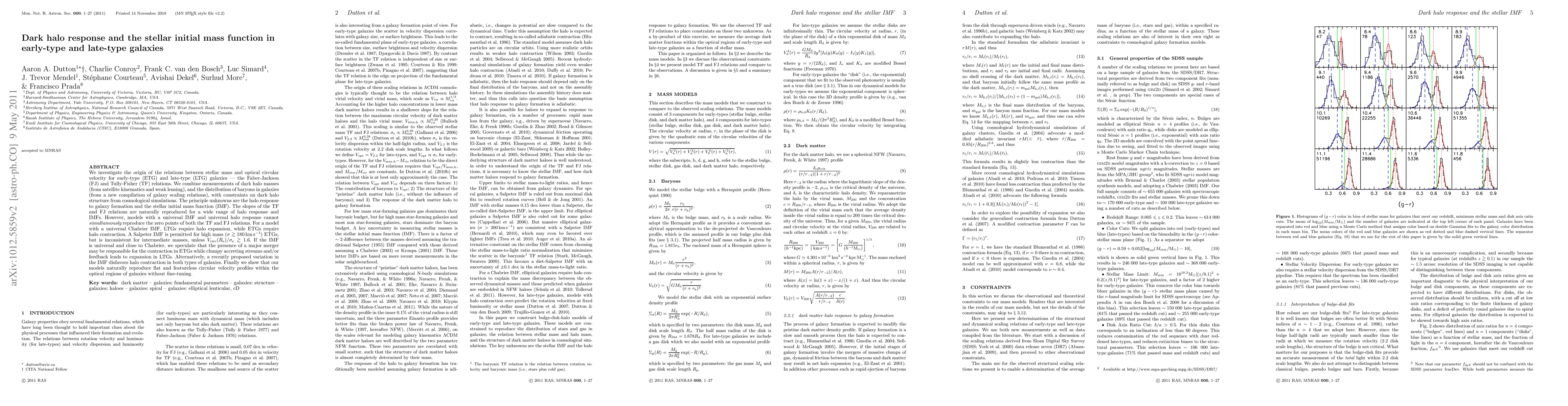 This study explores the Faber-Jackson and Tully-Fisher relations in early-type and late-type galaxies, linking stellar mass to optical circular velocity. By integrating dark halo mass data, baryonic distribution, and cosmological simulation insights, the research concludes that a universal IMF and halo response can't simultaneously explain both relations' zero points. Late-type galaxies likely expand due to various factors, while early-type galaxies contract, especially under specific IMF and merger conditions. The findings suggest that a Chabrier IMF and halo adjustments could account for observed galaxy properties without fine-tuning.