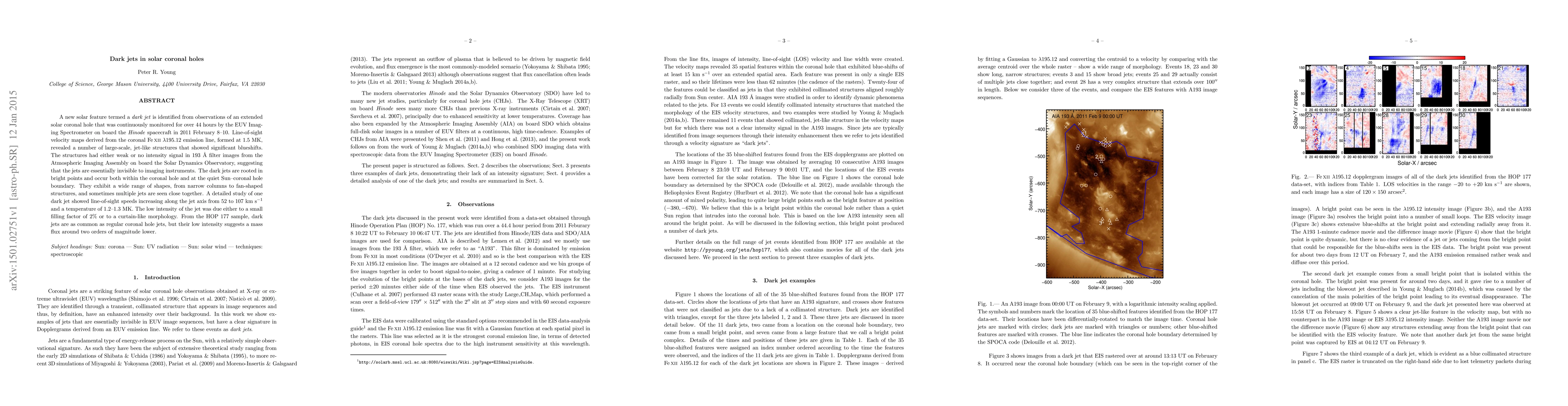The study identifies a new solar phenomenon called dark jets in solar coronal holes, observed via the Hinode spacecraft. These jets, invisible in 193 Å filter images, exhibit significant blueshifts and have a much lower mass flux compared to regular coronal jets.