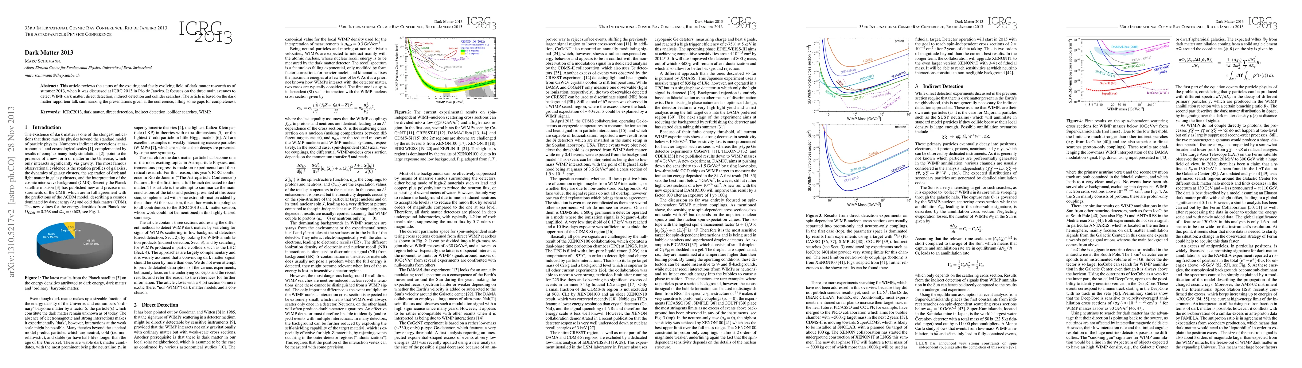 This paper reviews the state of dark matter research in 2013, focusing on the three primary detection methods: direct detection, indirect detection, and collider searches. It summarizes discussions from the ICRC 2013 conference in Rio de Janeiro, filling gaps for completeness.