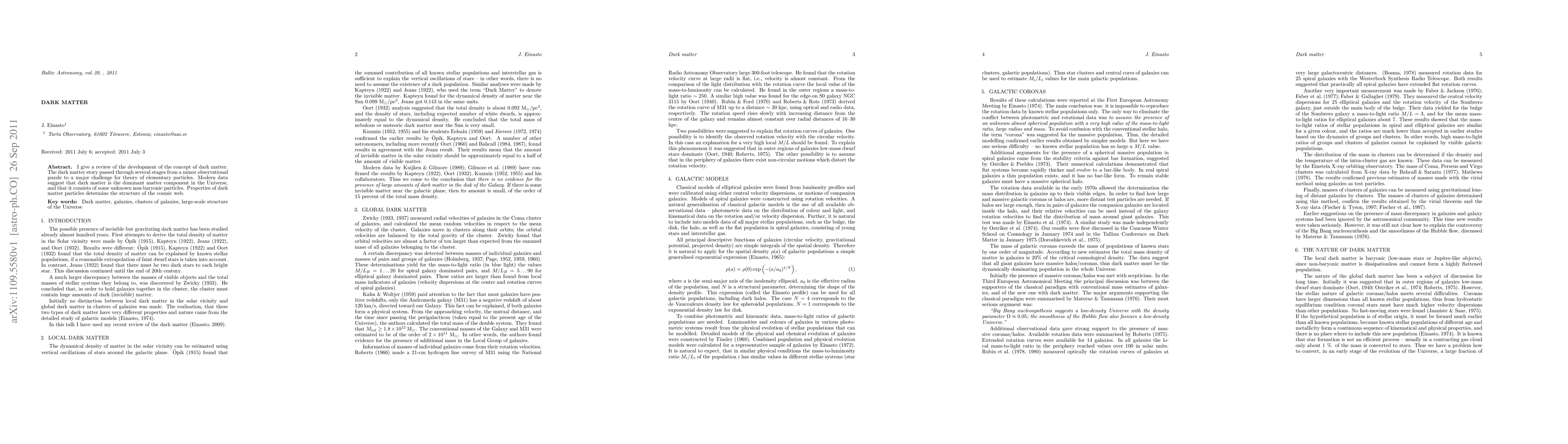 I give a review of the development of the concept of dark matter. The dark matter story passed through several stages from a minor observational puzzle to a major challenge for theory of elementary particles. Modern data suggest that dark matter is the dominant matter component in the Universe, and that it consists of some unknown non-baryonic particles. Properties of dark matter particles determine the structure of the cosmic web.