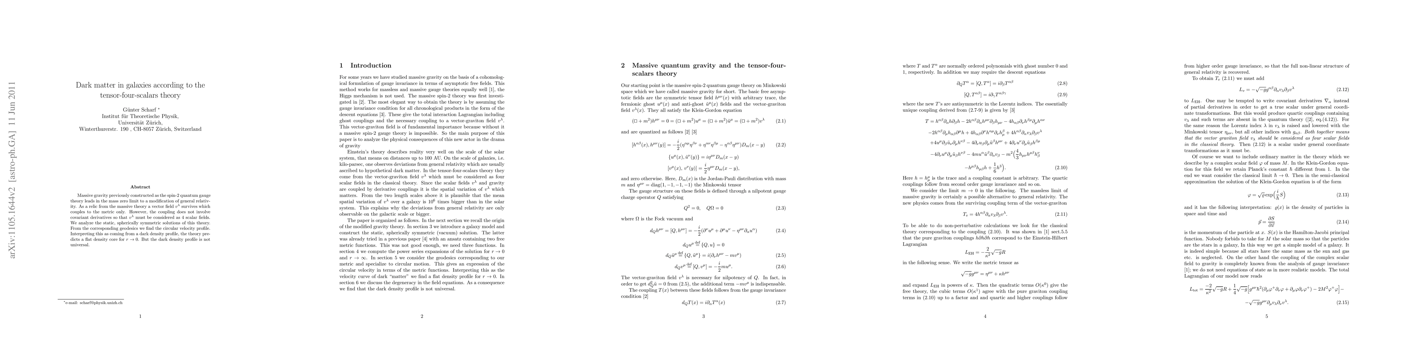 Massive gravity previously constructed as the spin-2 quantum gauge theory leads in the mass zero limit to a modification of general relativity. As a relic from the massive theory a vector field v survives which couples to the metric only. However, the coupling does not involve covariant derivatives so that v must be considered as 4 scalar fields. We analyse the static, spherically symmetric solutions of this theory. From the corresponding geodesics we find the circular velocity profile. Interpreting this as coming from a dark density profile, the theory predicts a flat density core for r going to 0. But the dark density profile is not universal.