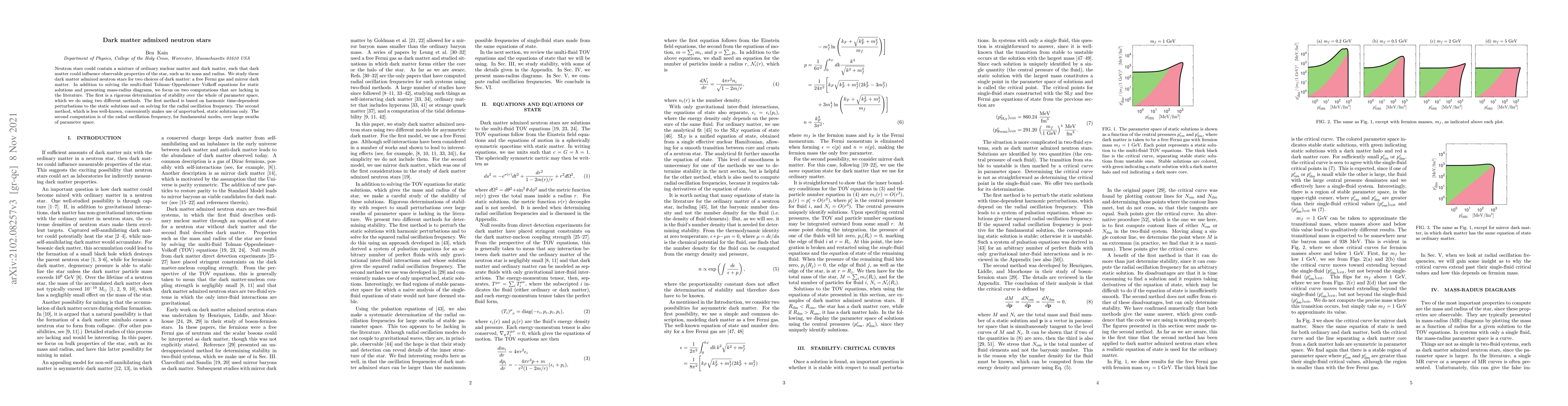 This paper investigates neutron stars containing dark matter admixtures, specifically focusing on two types: a free Fermi gas and mirror dark matter. It examines the influence on mass and radius, solves the multi-fluid Tolman-Oppenheimer-Volkoff equations, and rigorously determines stability over parameter space using two methods, alongside computing radial oscillation frequencies for fundamental modes.