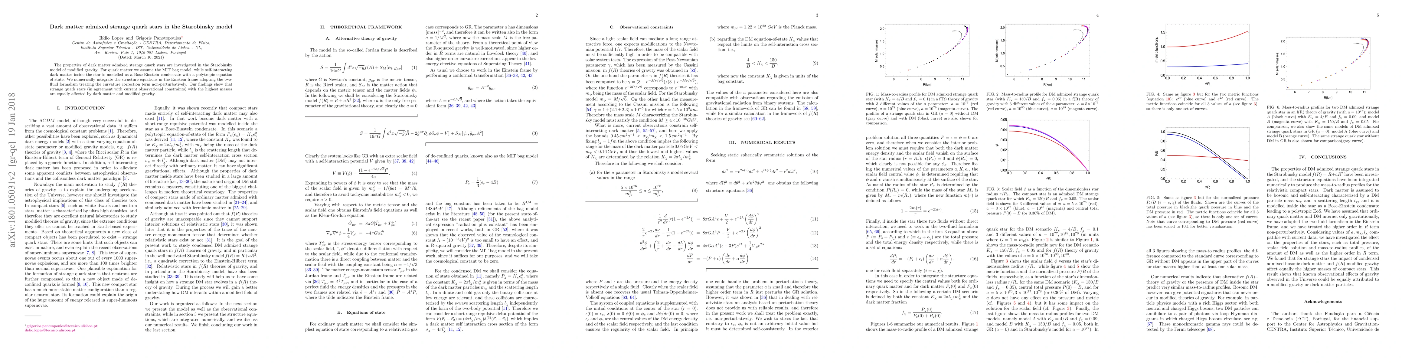 The paper presents a numerical analysis of dark matter admixed strange quark stars in the Starobinsky model of modified gravity, providing mass-to-radius profiles for various parameter values and demonstrating the equal impact of dark matter and modified gravity on high-mass compact stars.