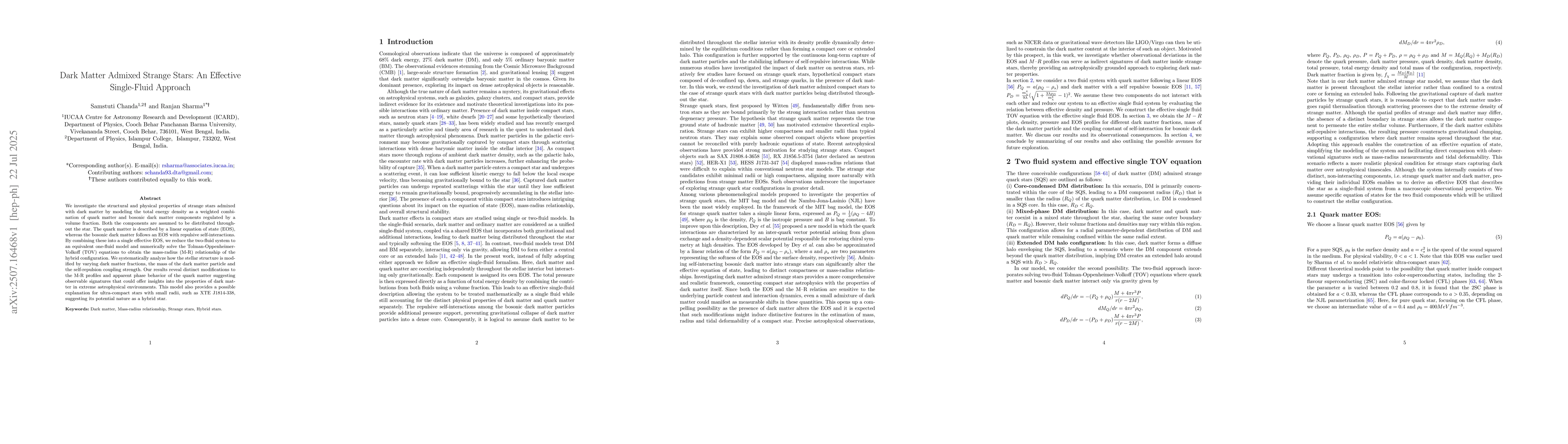 We investigate the structural and physical properties of strange stars admixed with dark matter by modeling the total energy density as a weighted combination of quark matter and bosonic dark matter components regulated by a volume fraction. Both the components are assumed to be distributed throughout the star. The quark matter is described by a linear equation of state (EOS), whereas the bosonic dark matter follows an EOS with repulsive self-interactions. By combining these into a single effective EOS, we reduce the two-fluid system to an equivalent one-fluid model and numerically solve the Tolman-Oppenheimer-Volkoff (TOV) equations to obtain the mass-radius (M-R) relationship of the hybrid configuration. We systematically analyze how the stellar structure is modified by varying dark matter fractions, the mass of the dark matter particle and the self-repulsion coupling strength. Our results reveal distinct modifications to the M-R profiles and apparent phase behavior of the quark matter suggesting observable signatures that could offer insights into the properties of dark matter in extreme astrophysical environments. This model also provides a possible explanation for ultra-compact stars with small radii, such as XTE J1814-338, suggesting its potential nature as a hybrid star.
