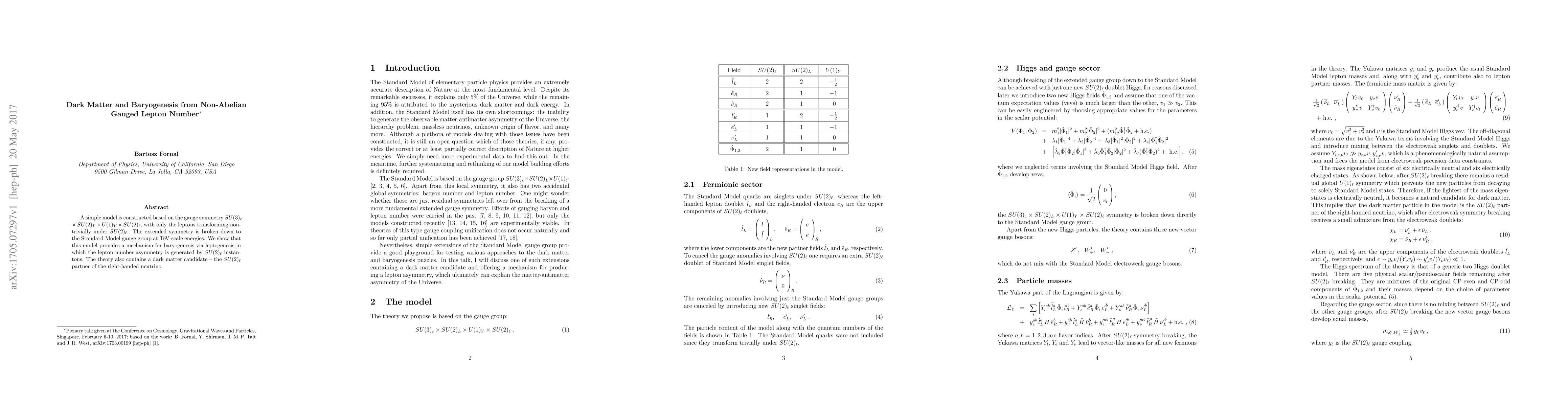 This paper proposes a model with an extended gauge symmetry that includes a non-Abelian gauged lepton number, leading to baryogenesis via leptogenesis and providing a dark matter candidate as the $SU(2)_\ell$ partner of the right-handed neutrino. The symmetry is broken at the TeV scale.