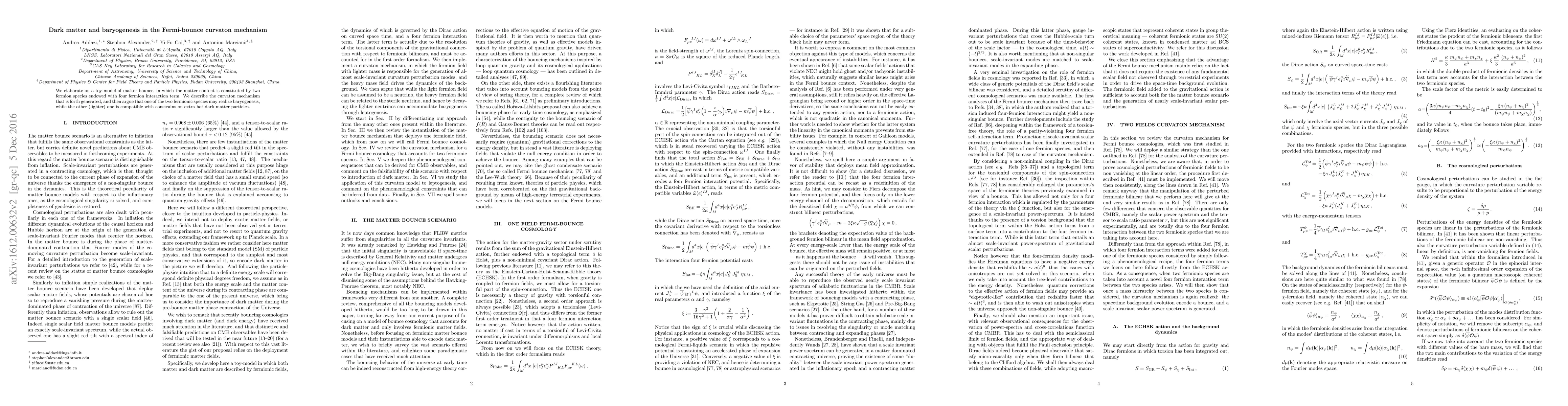 Research explores a 'Fermi-bounce curvaton mechanism' that connects dark matter to baryogenesis through the interaction of two fermion species. It suggests one species may realize baryogenesis while the other is compatible with constraints on extra hot dark matter particles.